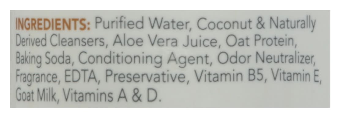 Ingredients: Purified Water, Coconut & Naturally Derived Cleansers, Aloe Vera Juice, Oat Protein, Baking Soda, Conditioning Agent, Odor Neutralizer, Fragrance, EDTA, Preservative, Vitamin B5, Vitamin E Goat Milk, Vitamins A & D Contains: Tree Nuts, Coconuts, Oat, Milk