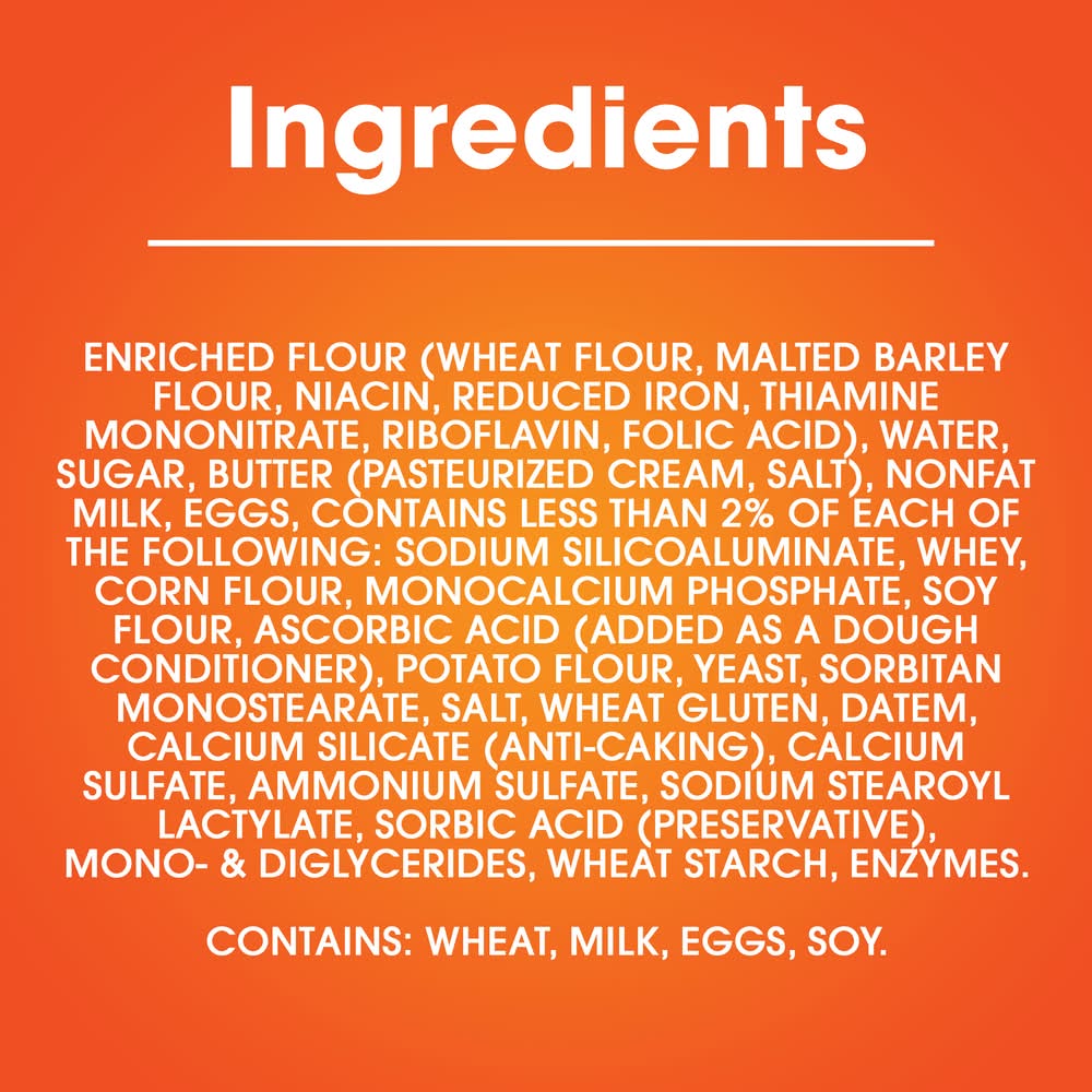 Ingredients: Enriched Flour Wheat Flour, Malted Barley Flour, Niacin, Reduced Iron, Thiamine Mononitrate, Riboflavin, Folic Acid, Water, Sugar, Butter Pasteurized Cream, Salt, Nonfat Milk, Contains Less than 2% of Each of the Following: Potato Flour, Eggs, Yeast, DATEM, Salt, Whey, Wheat Gluten, Degerminated Yellow Corn Flour, Sodium Stearoyl Lactylate, Sorbic Acid Preservative, Monocalcium Phosphate, Wheat Flour, Calcium Sulfate, Ascorbic Acid Added as Dough Conditioner, Wheat Starch, Sodium Silicoaluminate, Ammonium Sulfate, Enzymes, Sorbitan Monostearate, Mono- & Diglycerides, Calcium Silicate, Microcrystalline Cellulose. Contains: Wheat, Eggs, Gluten, Milk, Soybeans