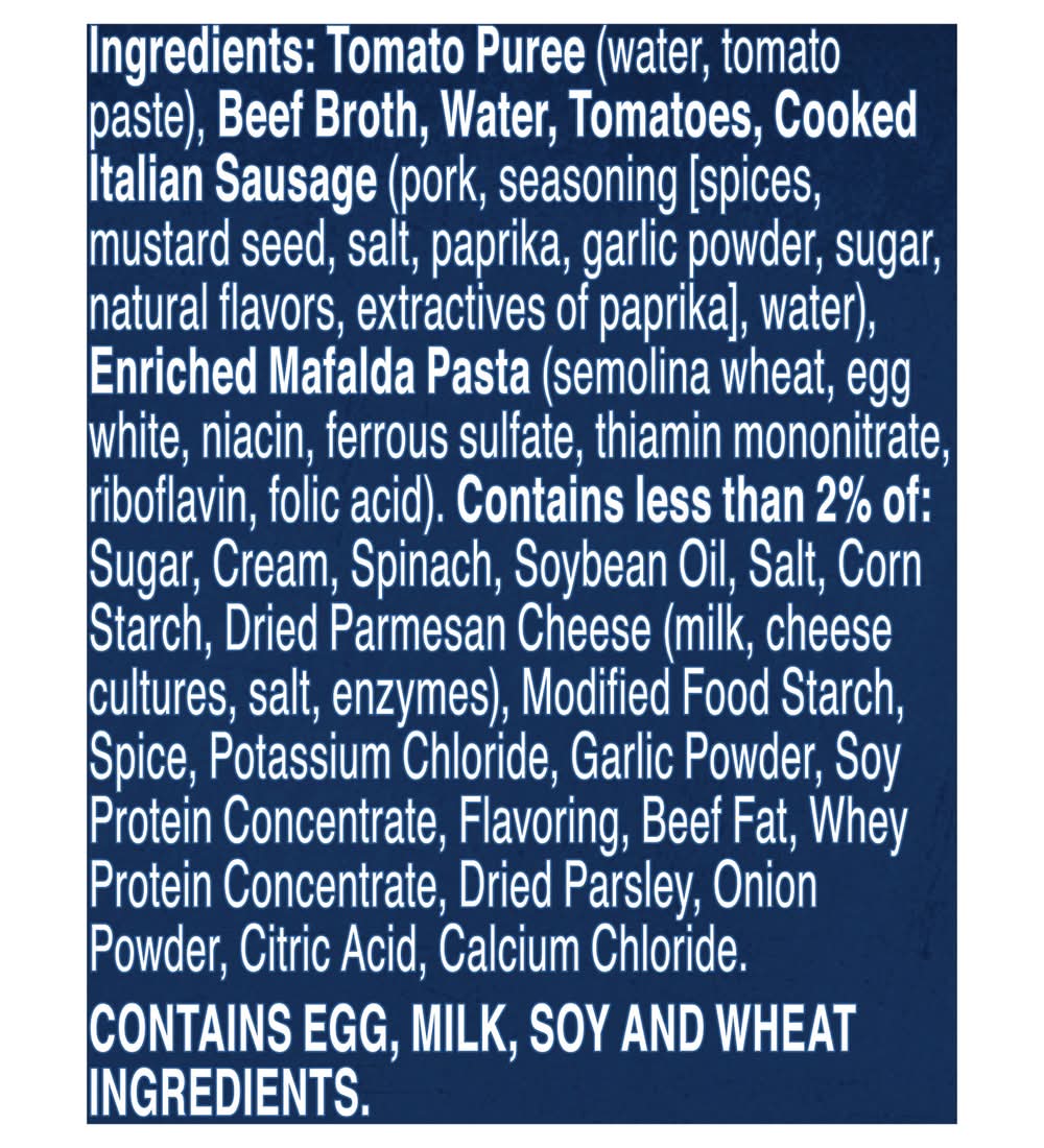 Ingredients: Tomato Puree (Water, Tomato Paste), Beef Broth, Water, Tomatoes, Cooked Italian Sausage (Pork, Seasoning [Spices, Mustard Seed, Salt, Paprika, Garlic Powder, Sugar, Natural Flavors, Extractives of Paprika], Water), Enriched Mafalda Pasta (Semolina Wheat, Egg White, Niacin, Ferrous Sulfate, Thiamin Mononitrate, Riboflavin, Folic Acid). Contains Less than 2% of: Sugar, Cream, Spinach, Soybean Oil, Salt, Corn Starch, Dried Parmesan Cheese (Milk, Cheese Cultures, Salt, Enzymes), Modified Food Starch, Spice, Potassium Chloride, Garlic Powder, Soy Protein Concentrate, Flavoring, Beef Fat, Whey Protein Concentrate, Dried Parsley, Onion Powder, Citric Acid, Calcium Chloride Contains: Milk, Mustard, Wheat, Eggs, Corn, Soybeans