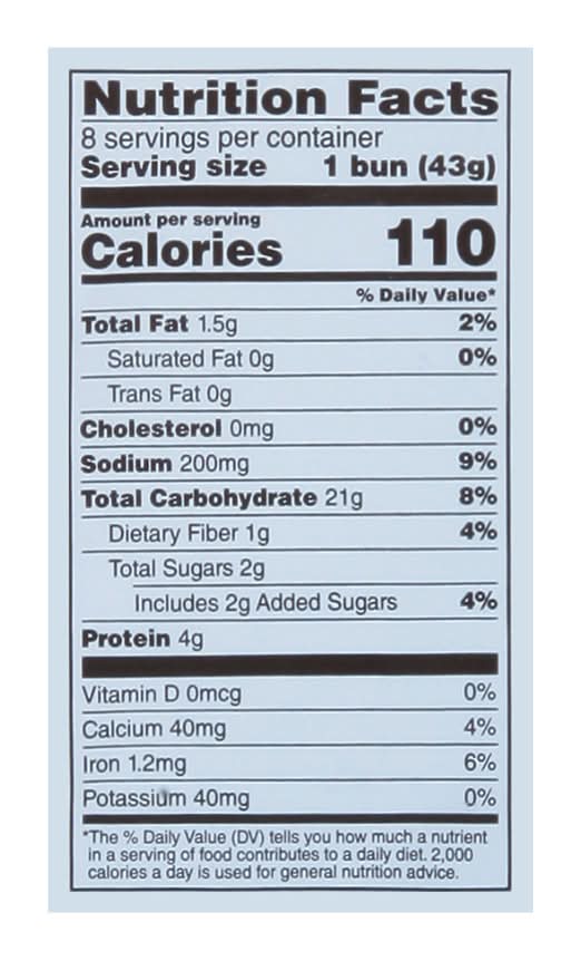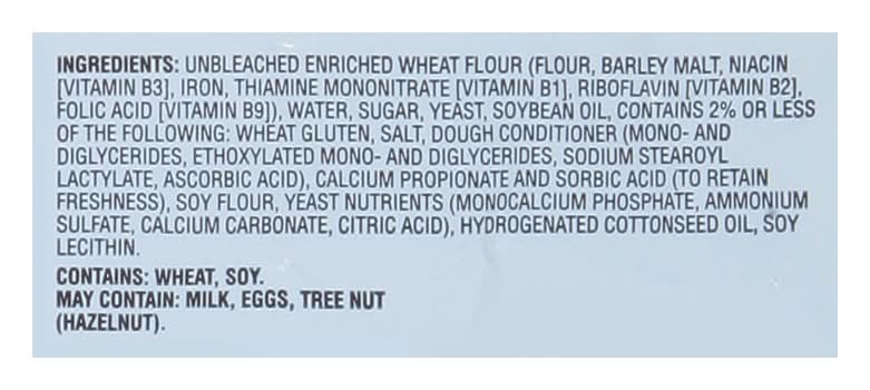 Ingredients: Unbleached Enriched Wheat Flour (Flour, Barley Malt, Niacin [Vitamin B3], Iron, Thiamine Mononitrate [Vitamin B1), Riboflavin [Vitamin B2), Folic Acid (Vitamin B9]), Water, Sugar, Yeast, Soybean Oil Contains 2% or Less of the Following: Wheat Gluten, Salt, Dough Conditioner (Mono- and Diglycerides, Ethoxylated Mono- and Diglycerides, Sodium Stearoyl Lactylate, Ascorbic Acid), Calcium Propionate and Sorbic Acid (to Retain Freshness), Soy Flour, Yeast Nutrients (Monocalcium Phosphate, Ammonium Sulfate, Calcium Carbonate, Citric Acid), Hydrogenated Cottonseed Oil, Soy Lecithin Contains: Wheat, Soybeans, Barley, Gluten, Milk, Eggs, Tree Nuts, Hazelnuts/Filberts
