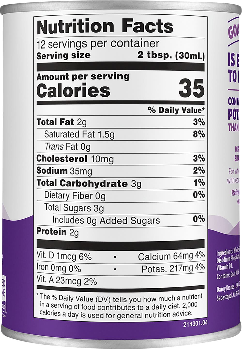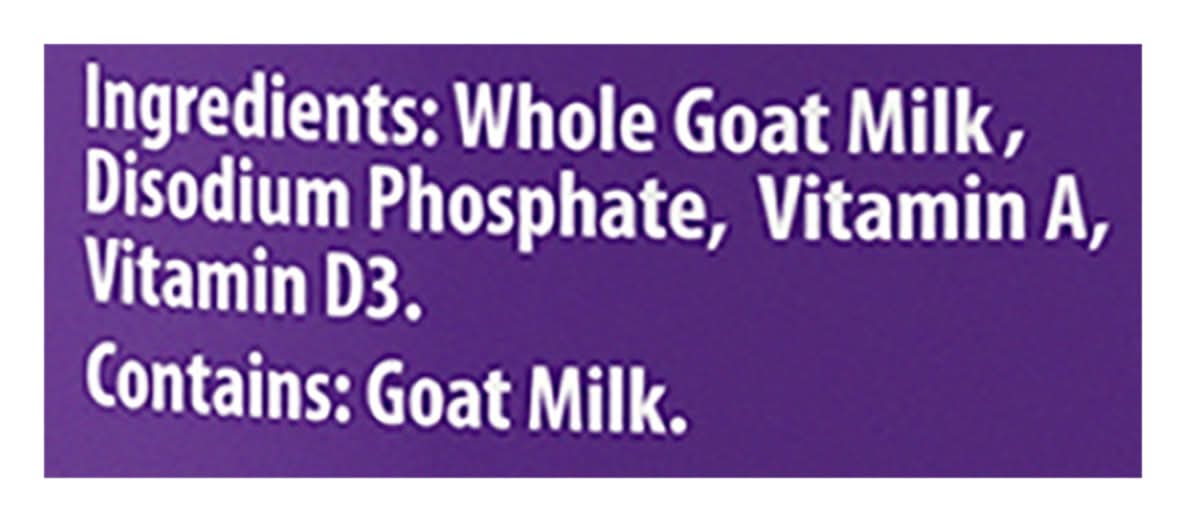Ingredients: Whole Goat Milk, Disodium Phosphate, Vitamin A, Vitamin D3 Contains: Milk