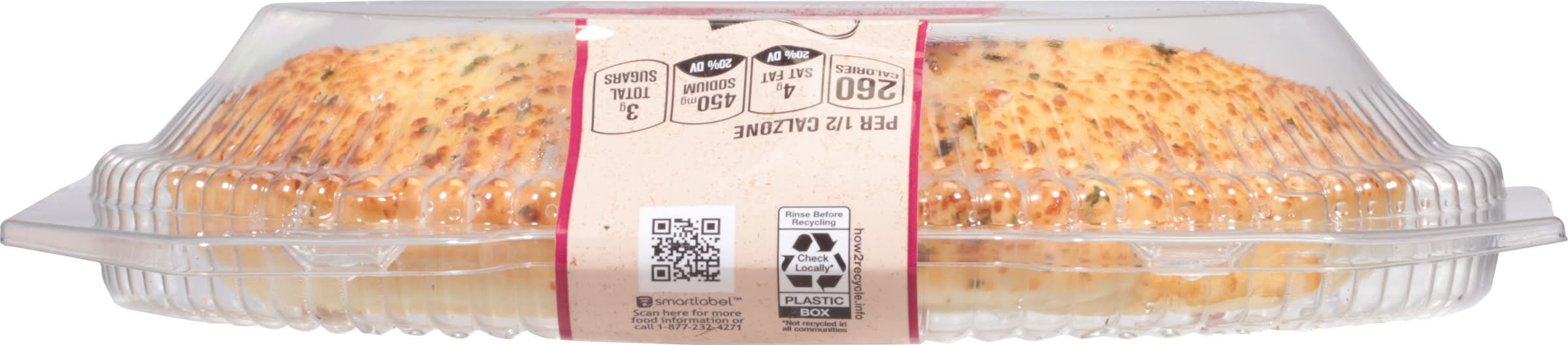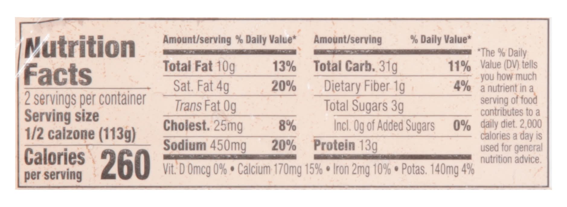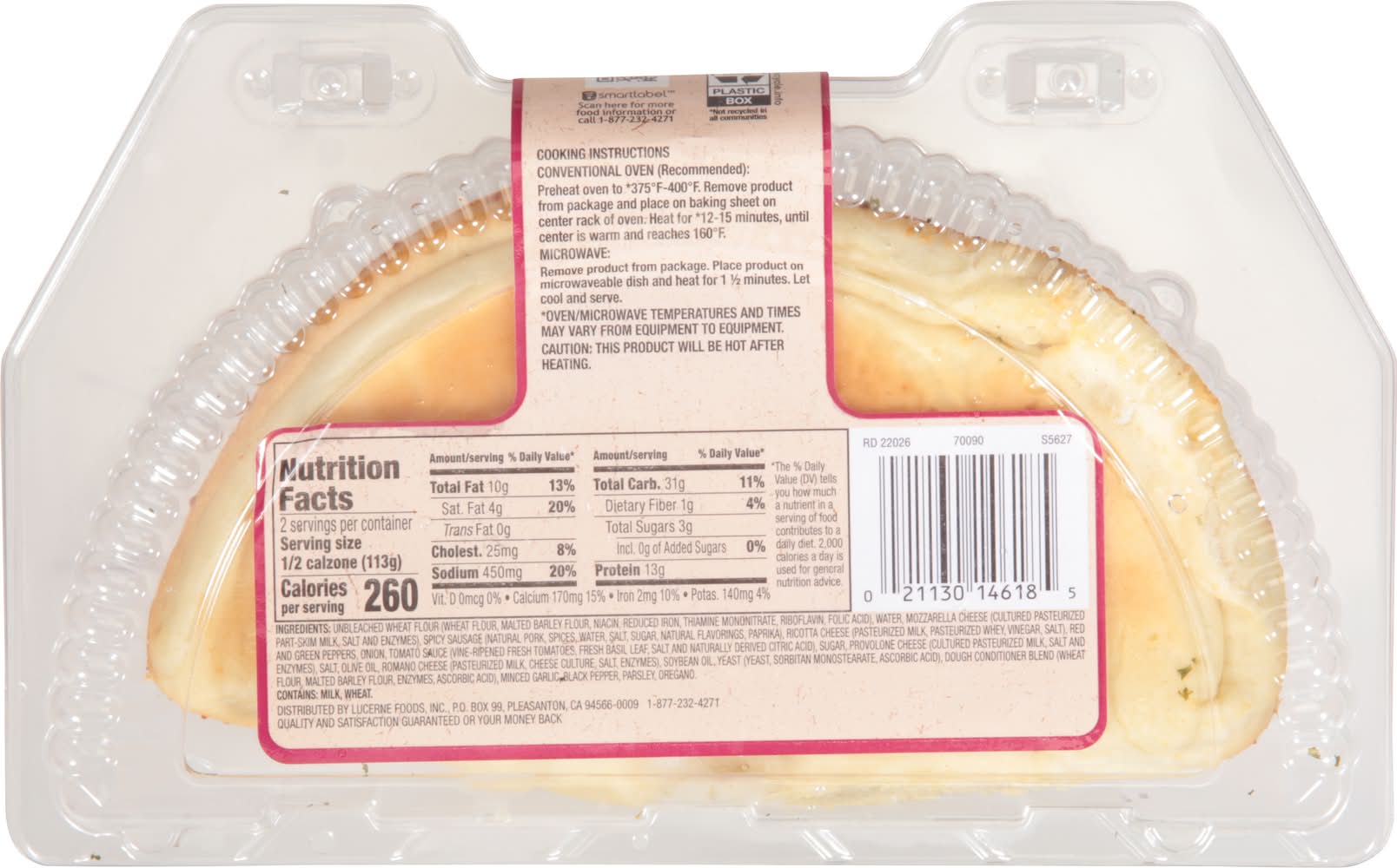 Spicy sausage, peppers & onion four cheese stuffed calzone. Per 1/2 Calzone: 260 calories; 4.5 g sat fat (20% DV); 450 mg sodium (20% DV); 3 g total sugars. Quality and satisfaction guaranteed or your money back. how2recycle.info. Smartlabel: Scan for more food information or call 1-877-232-4271. • Number of servings: 2 • Lucerne Foods, Inc., Pleasanton, CA, 94566-0009 • Packaging: Reusable