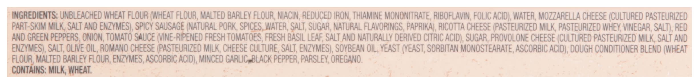Ingredients: Unbleached Wheat Flour (Wheat Flour, Malted Barley Flour, Niacin, Reduced Iron, Thiamine Mononitrate, Riboflavin, Folic Acid), Water, Mozzarella Cheese (Cultured Pasteurized Part-Skim Milk, Salt and Enzymes), Spicy Sausage (Natural Pork, Spices, Water, Salt, Sugar, Natural Flavorings, Paprika), Ricotta Cheese (Pasteurized Milk, Pasteurized Whey, Vinegar, Salt), Red and Green Peppers, Onion, Tomato Sauce (Vine-Ripened Fresh Tomatoes, Fresh Basil Leaf, Salt and Naturally Derived Citric Acid), Sugar, Provolone Cheese (Cultured Pasteurized Milk, Salt and Enzymes), Salt, Olive Oil, Romano Cheese (Pasteurized Milk, Cheese Culture, Salt, Enzymes), Soybean Oil, Yeast (Yeast, Sorbitan Monostearate, Ascorbic Acid), Dough Conditioner Blend (Wheat Flour, Malted Barley Flour, Enzymes, Ascorbic Acid), Minced Garlic, Black Pepper, Parsley, Oregano. Contains: Milk, Wheat, Barley, Soybeans