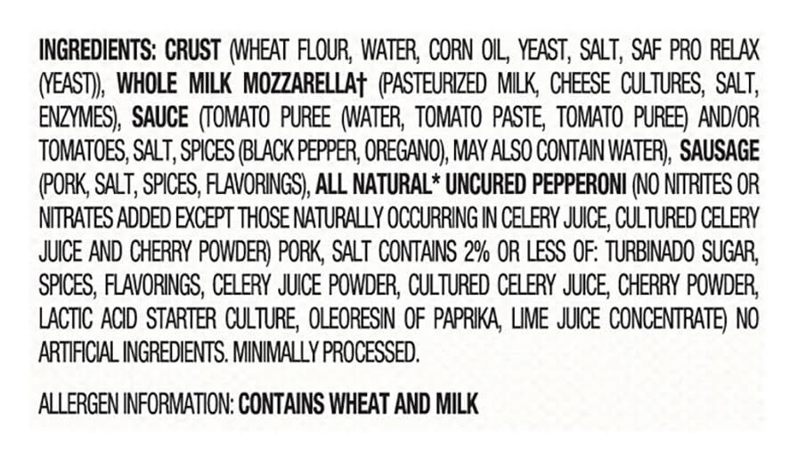 Ingredients: Crust (Wheat Flour, Water, Corn Oil, Yeast, Salt, Saf Pro Relax (Yeast)), Whole Milk Mozzarella(a) (Pasteurized Milk, Cheese Cultures, Salt, Enzymes), Sauce (Tomato Puree (Water, Tomato Paste, Tomato Puree) and/or Tomatoes, Salt, Spices (Black Pepper, Oregano), May Also Contain Water), Sausage (Pork, Salt, Spices, Flavorings), All Natural* Uncured Pepperoni (No Nitrites or Nitrates Added Except Those Naturally Occurring in Celery Juice, Cultured Celery Juice and Cherry Powder) Pork, Salt Contains 2% or Less of: Turbinado Sugar, Spices, Flavorings, Celery Juice Powder, Cultured Celery Juice, Cherry Powder, Lactic Acid Starter Culture, Oleoresin of Paprika, Lime Juice Concentrate). No Artificial Ingredients, Minimally Processed. (a) Cheese from Milk of Cows Not Treated with rBST. No Significant Difference Has Been Shown Between Milk Derived from rBST Treated and Non-rBST Treated Cows. * No Artificial Ingredients, Minimally Processed Contains: Wheat, Milk, Celery