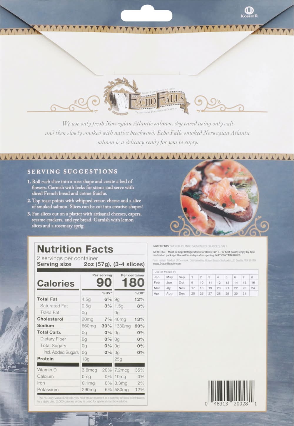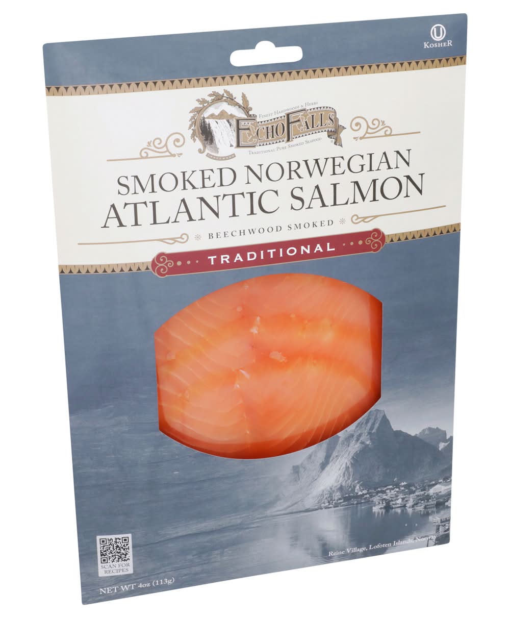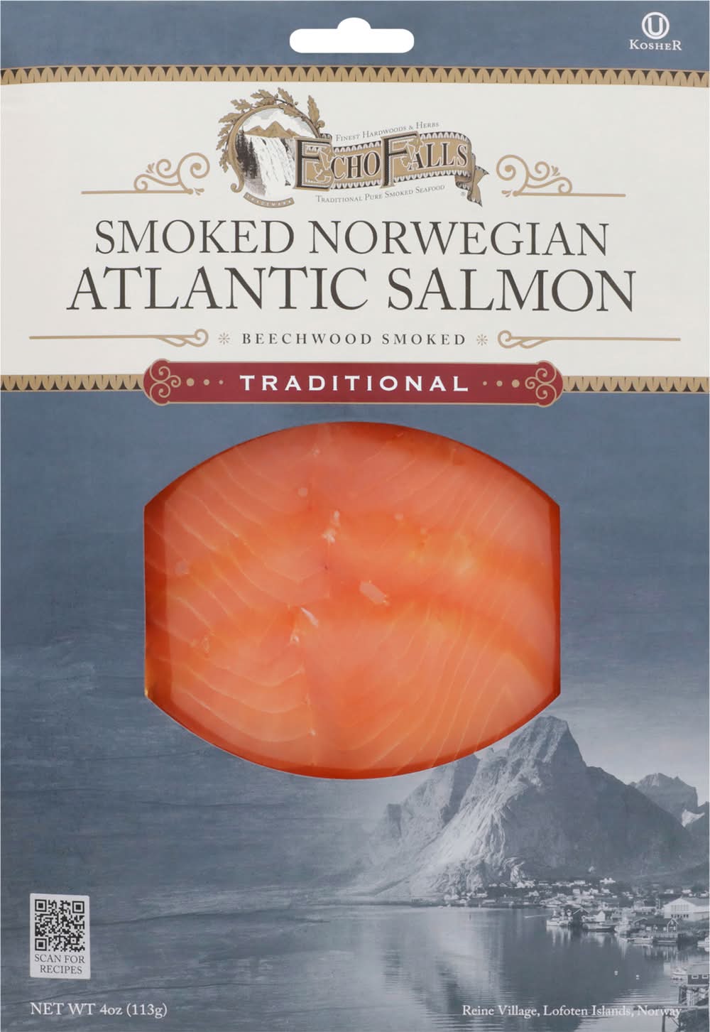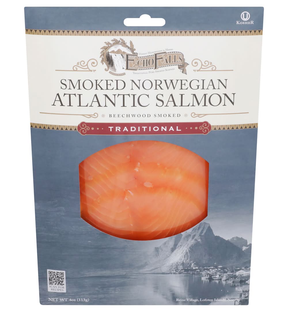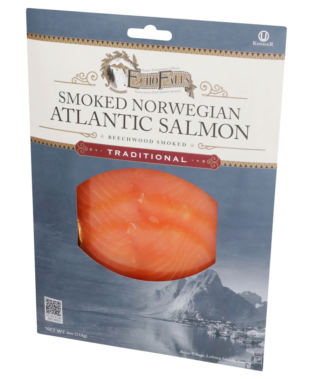 Finest hardwoods & herbs. Traditional pure smoked seafood. Reine Village, Lofoten Islands, Norway. We use only fresh Norwegian Atlantic salmon, dry cured using only salt and then slowly smoked with native beechwood. Echo Falls smoked Norwegian Atlantic salmon is a delicacy ready for you to enjoy. Number of servings: 2