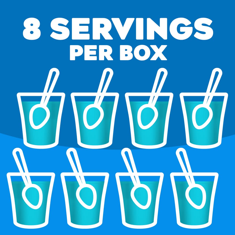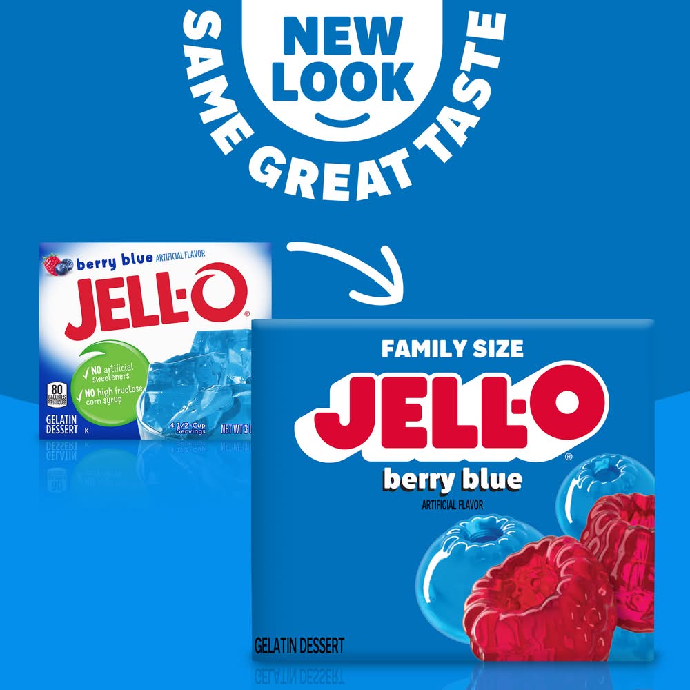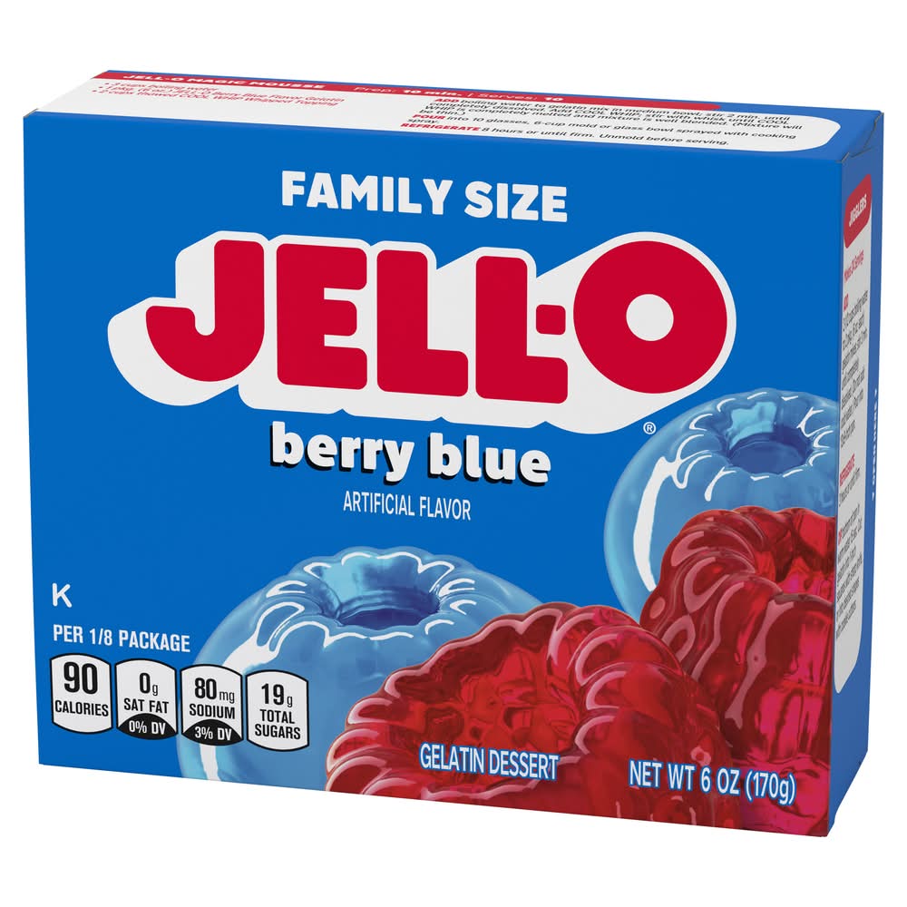 Snack happy. Jell-O Berry Blue Artificially Flavored Gelatin Dessert Mix lets you add some wonder to your day with a delicious snack. Spoon up a smile with our artificially flavored berry blue Jell-O gelatin that contains 80 calories per serving. Our colorful, jiggly treat is perfect for everyday snacking or special occasions with family and friends. Additionally, our gelatin dessert mix is a versatile ingredient for creating desserts like poke cakes, parfaits, pretzel salads, rainbow layer cakes and more. Our artificially flavored berry blue gelatin dessert is easy to prepare. Simply add 2 cups boiling water to the gelatin mix, stir for 2 minutes until completely dissolved, stir in 2 cups cold water, then refrigerate for 4 hours or until firm. Each family size Jell-O gelatin dessert mix is individually packaged in a 6-ounce sealed pouch and makes 8, 1/2-cup servings. • Flavor: Berry blue • Kraft Heinz Foods Company, Chicago, IL, 60601 • Packaging: Reusable