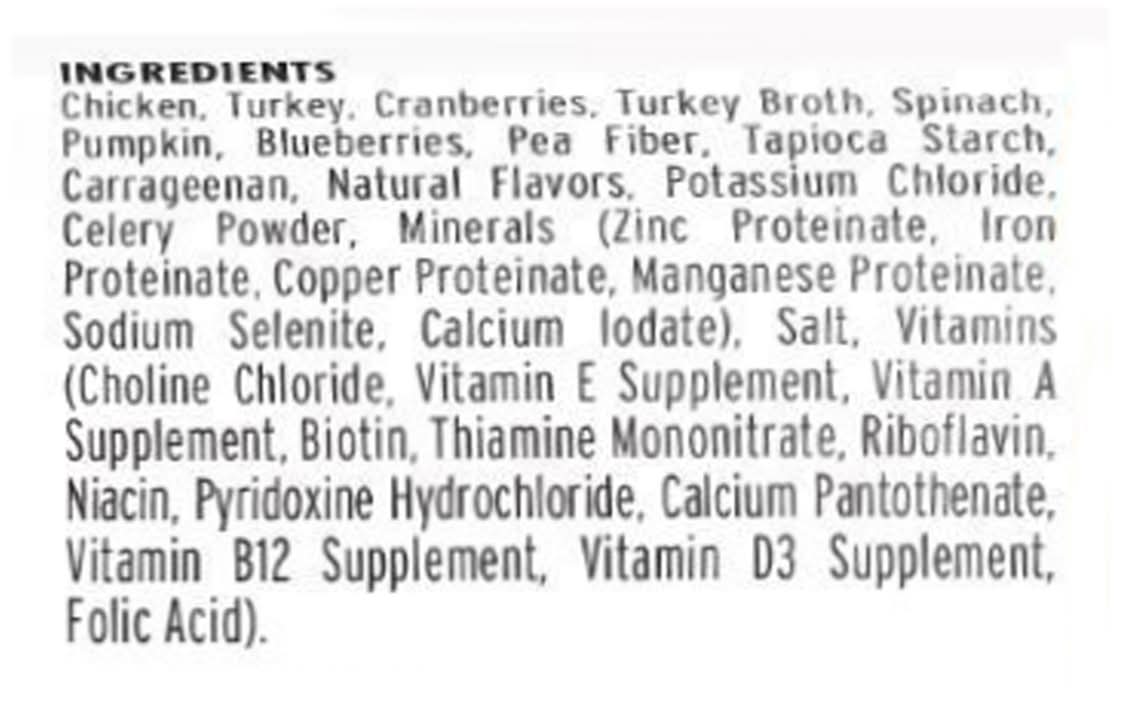 Ingredients: Chicken, Turkey, Cranberries, Turkey Broth, Spinach, Pumpkin, Blueberries, Pea Fiber, Tapioca Starch, Carrageenan, Natural Flavors, Potassium Chloride, Celery Powder, Minerals (Zinc Proteinate Iron Proteinate Copper Proteinate Manganese Proteinate Sodium Selenite Calcium Lodate), Salt, Vitamins (Choline Chloride Vitamin E Supplement Vitamin a Supplement Biotin Thiamine Mononitrate Riboflavin Niacin Pyridoxine Hydrochloride Calcium Pantothenate Vitamin B12 Supplement Vitamin D3 Supplement Folic Acid)