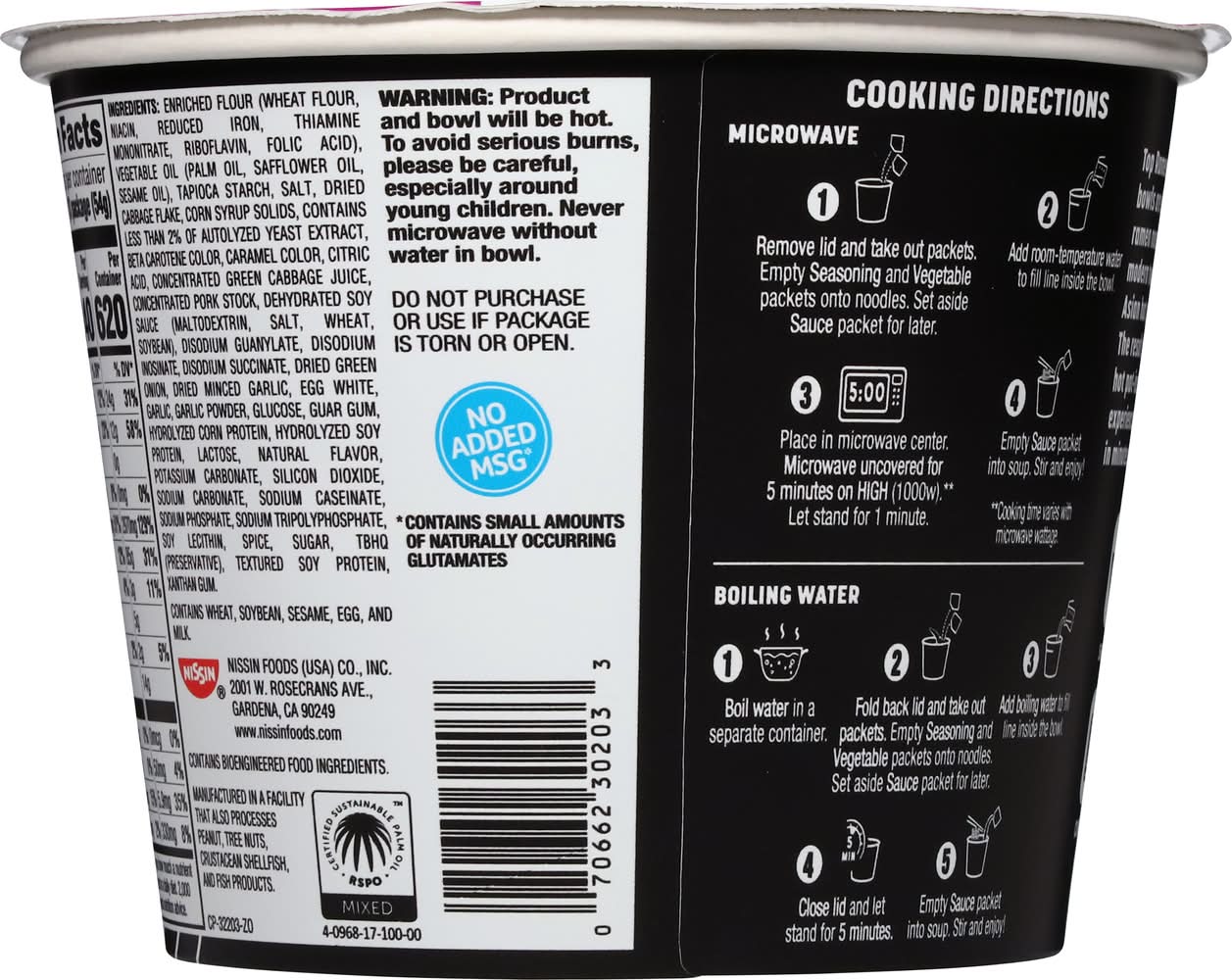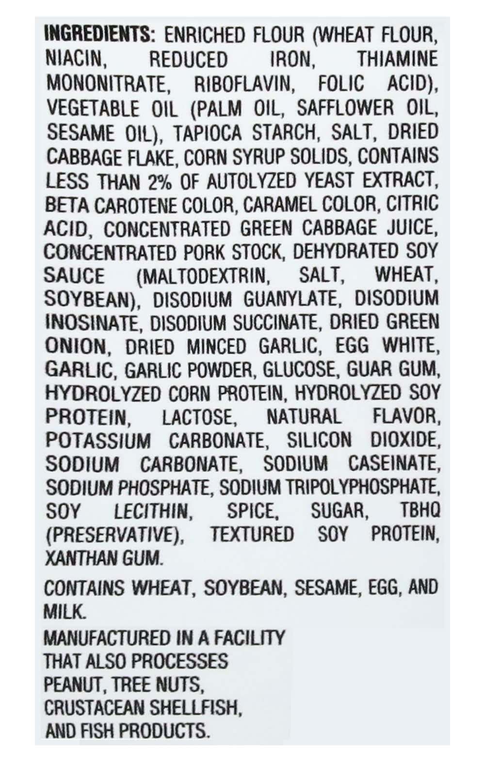 Ingredients: Enriched Flour (Wheat Flour, Niacin, Reduced Iron, Thiamine Mononitrate, Riboflavin, Folic Acid), Vegetable Oil (Palm Oil, Safflower Oil, Sesame Oil), Tapioca Starch, Salt, Dried Cabbage Flake, Corn Syrup Solids, Contains Less than 2% of Autolyzed Yeast Extract, Beta Carotene Color, Caramel Color, Citric Acid, Concentrated Green Cabbage Juice, Concentrated Pork Stock, Dehydrated Soy Sauce (Maltodextrin, Salt, Wheat, Soybean), Disodium Guanylate, Disodium Inosinate, Disodium Succinate, Dried Green Onion, Dried Minced Garlic, Egg White, Garlic, Garlic Powder, Glucose, Guar Gum, Hydrolyzed Corn Protein, Hydrolyzed Soy Protein, Lactose, Natural Flavor, Potassium Carbonate, Silicon Dioxide, Sodium Carbonate, Sodium Caseinate, Sodium Phosphate, Sodium Tripolyphosphate, Soy Lecithin, Spice, Sugar, TBHQ (Preservative), Textured Soy Protein, Xanthan Gum Contains: Wheat, Soybeans, Sesame, Eggs, Milk, Lactose, Peanuts, Tree Nuts, Crustacean Shellfish, Fish Additives: Genetically Modified Ingredients