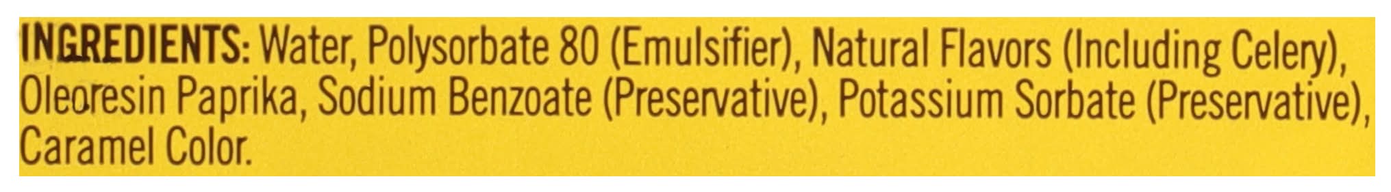 Ingredients: Water, Polysorbate 80 (Emulsifier), Natural Flavors (Including Celery), Oleoresin Paprika, Sodium Benzoate (Preservative), Potassium Sorbate (Preservative), Caramel Color Contains: Celery
