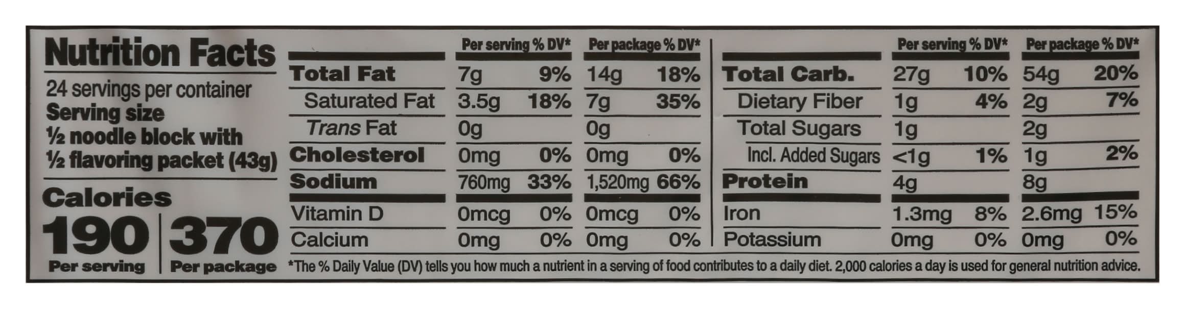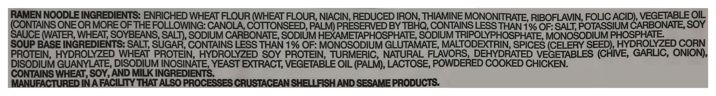 Ingredients: Ramen Noodle Ingredients: Enriched Wheat Flour (Wheat Flour, Niacin, Reduced Iron, Thiamine Mononitrate, Riboflavin, Folic Acid), Vegetable Oil (Contains One or More of the Following: Canola, Cottonseed, Palm) Preserved by TBHQ, Contains Less than 1% of: Salt, Potassium Carbonate, Soy Sauce (Water, Wheat, Soybeans, Salt), Sodium Carbonate, Sodium Hexametaphosphate, Sodium Tripolyphosphate, Monosodium Phosphate. Soup Base Ingredients: Salt, Sugar, Contains Less than 1% of: Monosodium Glutamate, Maltodextrin, Spices (Celery Seed), Hydrolyzed Corn Protein, Hydrolyzed Wheat Protein, Hydrolyzed Soy Protein, Turmeric, Natural Flavors, Dehydrated Vegetables (Chive, Garlic, Onion), Disodium Guanylate, Disodium Inosinate, Yeast Extract, Vegetable Oil (Palm), Lactose, Powdered Cooked Chicken Contains: Wheat, Soybeans, Milk, Celery, Corn, Lactose, Crustacean Shellfish, Sesame