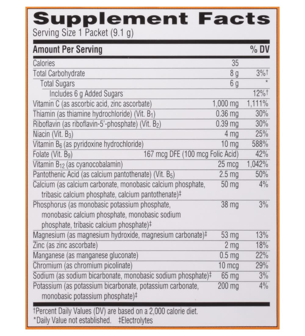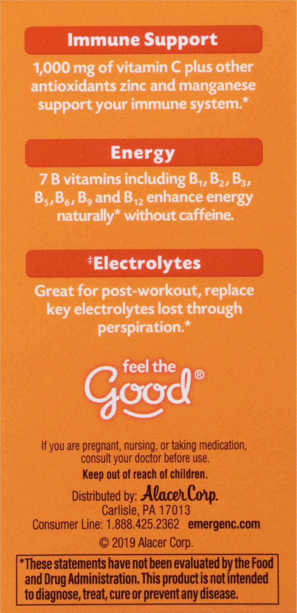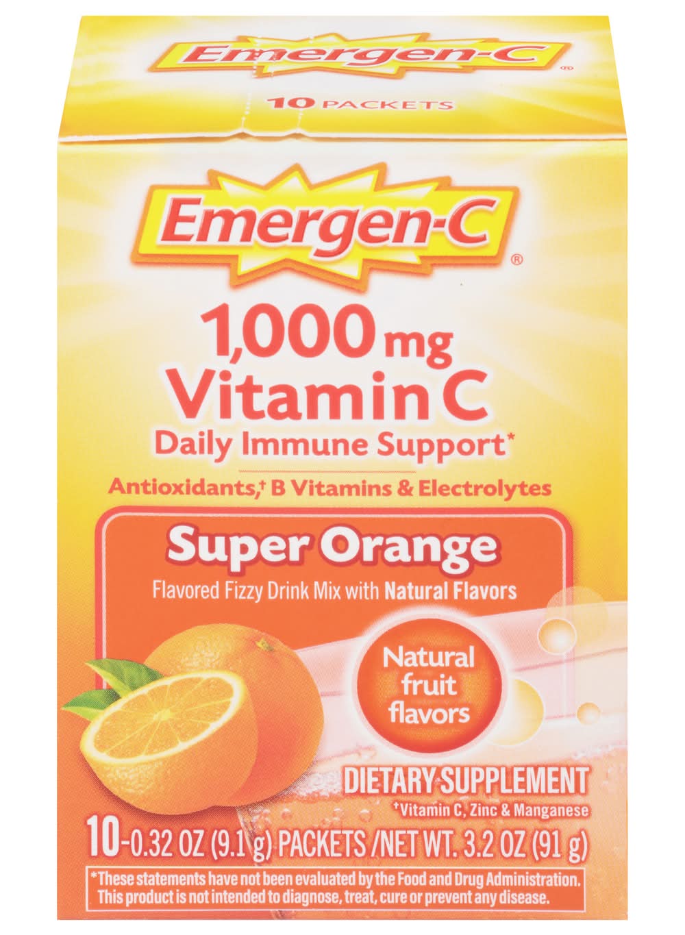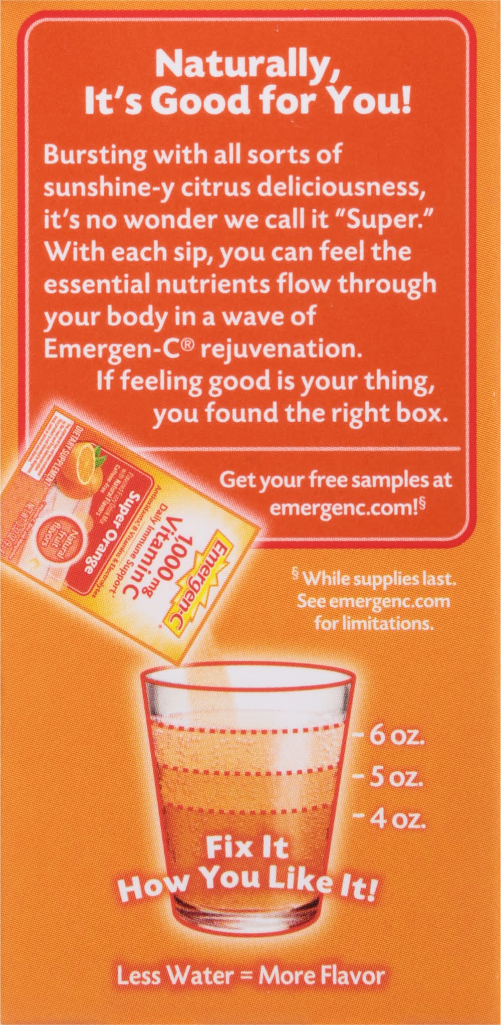 Emergen-C 1000mg Vitamin C Daily Immune Support Powder dietary supplement helps you achieve your wellness goals with a fizzy dietary supplement for daily immune support (1). Each vitamin mix serving contains more vitamin C than 10 oranges (2), plus other antioxidants zinc and manganese for immune support (1). These dietary supplements also come with B vitamins for energy support and electrolytes to help replace those lost through perspiration (1). They come in convenient packets that provide a delicious choice as a post-workout drink to replace key electrolytes lost through perspiration (1) with natural fruit flavor and natural sweeteners. Emergen-C Super Orange flavored powdered vitamin mix is easy to dissolve. Mix one packet with 4 to 6 ounces of water. Transform every day with vitamin C supplements from Emergen-C. (1) This statement has not been evaluated by the Food and Drug Administration. This product is not intended to diagnose, treat, cure, or prevent any disease. (2) Based on using the USDA.gov nutrient database value for a large, raw orange. • Pack size: 10 • Alacer Corp, Carlisle, PA, 17013 • Packaging: Reusable