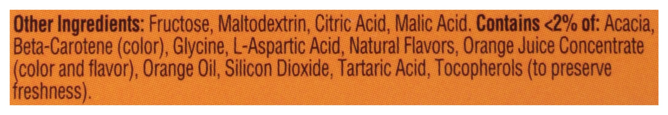 Ingredients: Fructose, Maltodextrin, Citric Acid, Malic Acid. Contains 2% of Acacia, Beta-Carotene (Color), Glycine, L-Aspartic Acid, Natural Flavors, Orange Juice Concentrate, Orange Oil, Silicon Dioxide, Tartaric Acid, Tocopherols (to Preserve Freshness).
