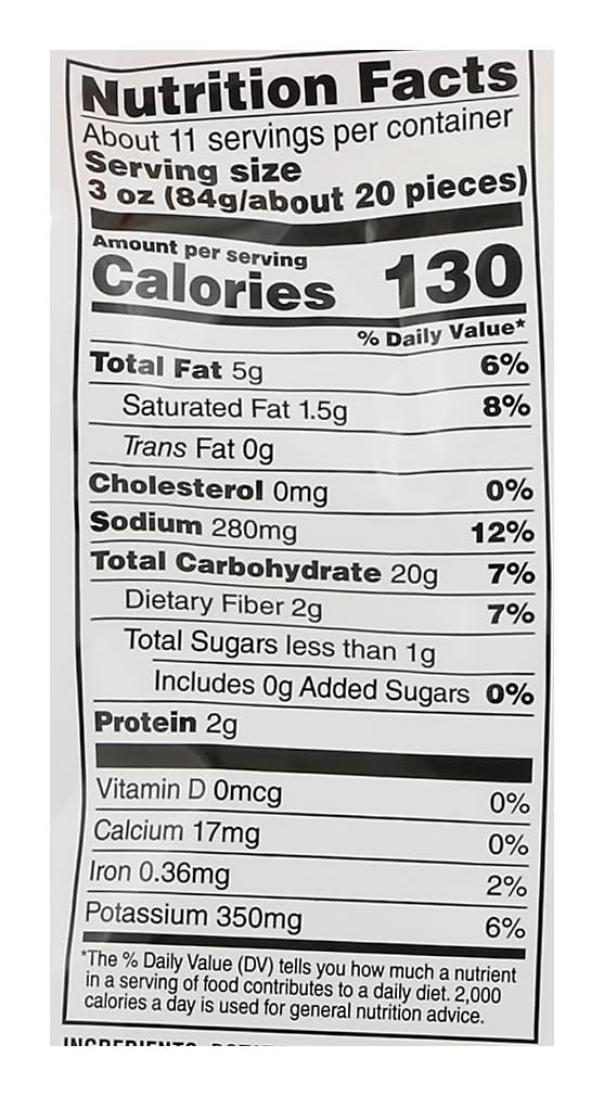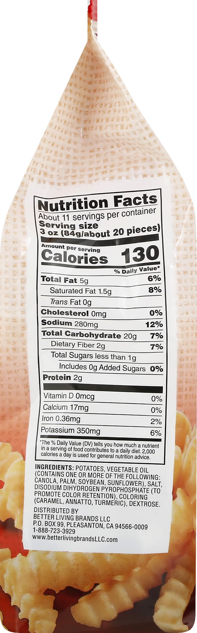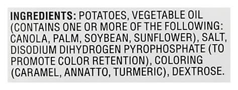 Ingredients: Potatoes, Vegetable Oil (Contains One or More of the Following: Canola, Palm, Soybean, Sunflower), Salt, Disodium Dihydrogen Pyrophosphate (to Promote Color Retention), Coloring (Caramel, Annatto, Turmeric), Dextrose. Contains: Soybeans