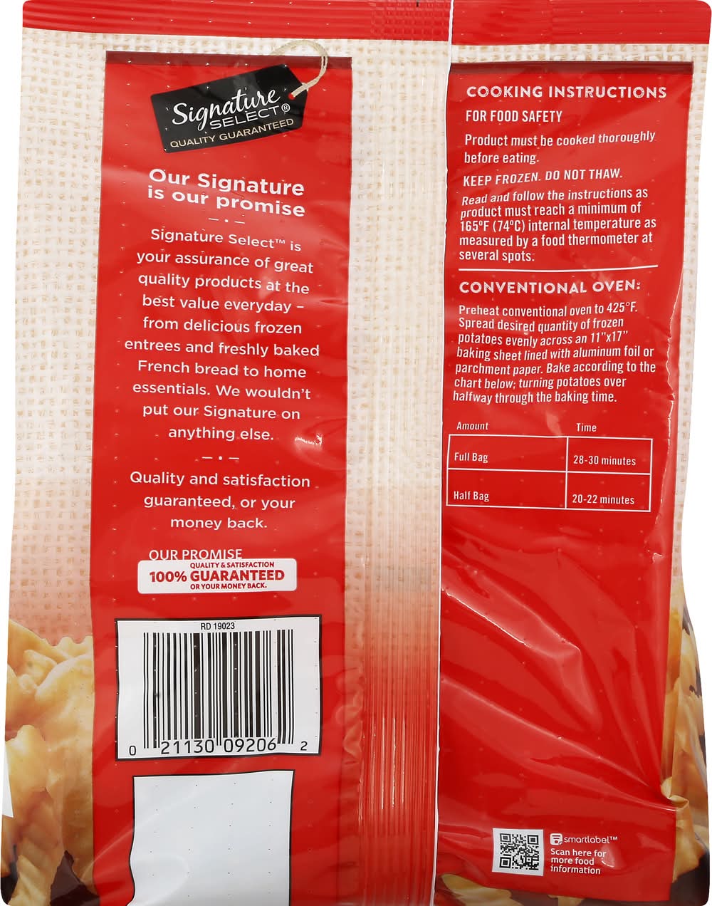 Directions for use: Cooking Instructions: For food safety. Product must be cooked thoroughly before eating. Keep frozen. Do not thaw. Read and follow the instructions as product must reach a minimum of 165 degrees F (74 degrees C) internal temperature as measured by a food thermometer at several pots. Conventional Oven: Preheat conventional oven to 425 degrees F. Spread desired quantity of frozen potatoes evenly across an 11 inch x 17 inch baking sheet lined with aluminum foil or parchment paper. Bake according to the chart below; turning potatoes over halfway through the baking time. Amount: Full bag; Time: 28-30 minutes. Amount: Half bag; Time: 20-22 minutes. Keep frozen. Storage recommendation: Keep frozen.