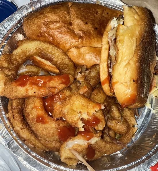 Pulled pork, ham, Swiss cheese, pickles, and mustard in a garlic panini. Served with French fries or a mixed green salad with lettuce, tomato, and pickle.