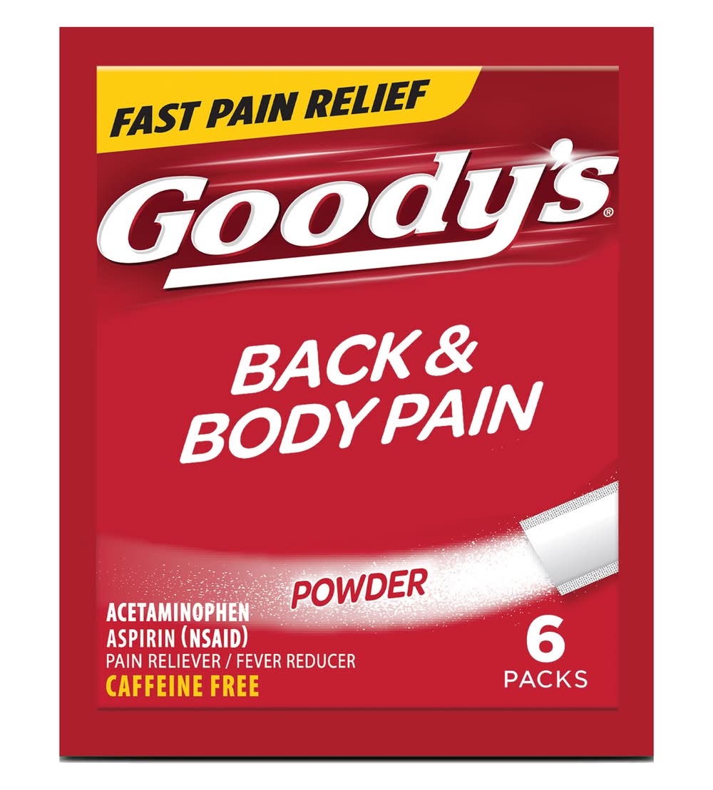 Goody's Back & Body Fast Pain Relief is a caffeine-free product available in a package of six counts.