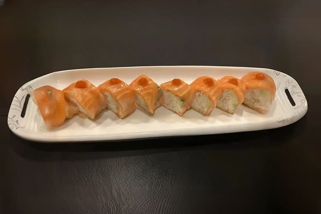 Crab meat, avocado wrapped with soy paper, and salmon topped with ponzu and sriracha.