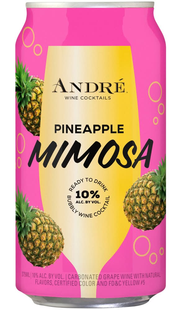 A pre-made mimosa? André has you covered. André Pineapple Mimosa Sparkling Wine Cocktail is premixed, ready to drink and packed with sweet and tropical pineapple flavors. This premixed drink contains 3 mimosas in one 12 ounce can with 10% alcohol by volume. Whether it's Sunday morning brunch at home with friends or tailgating before a football game, this premixed mimosa in a can is ready when you are. Alcohol by volume: 10%