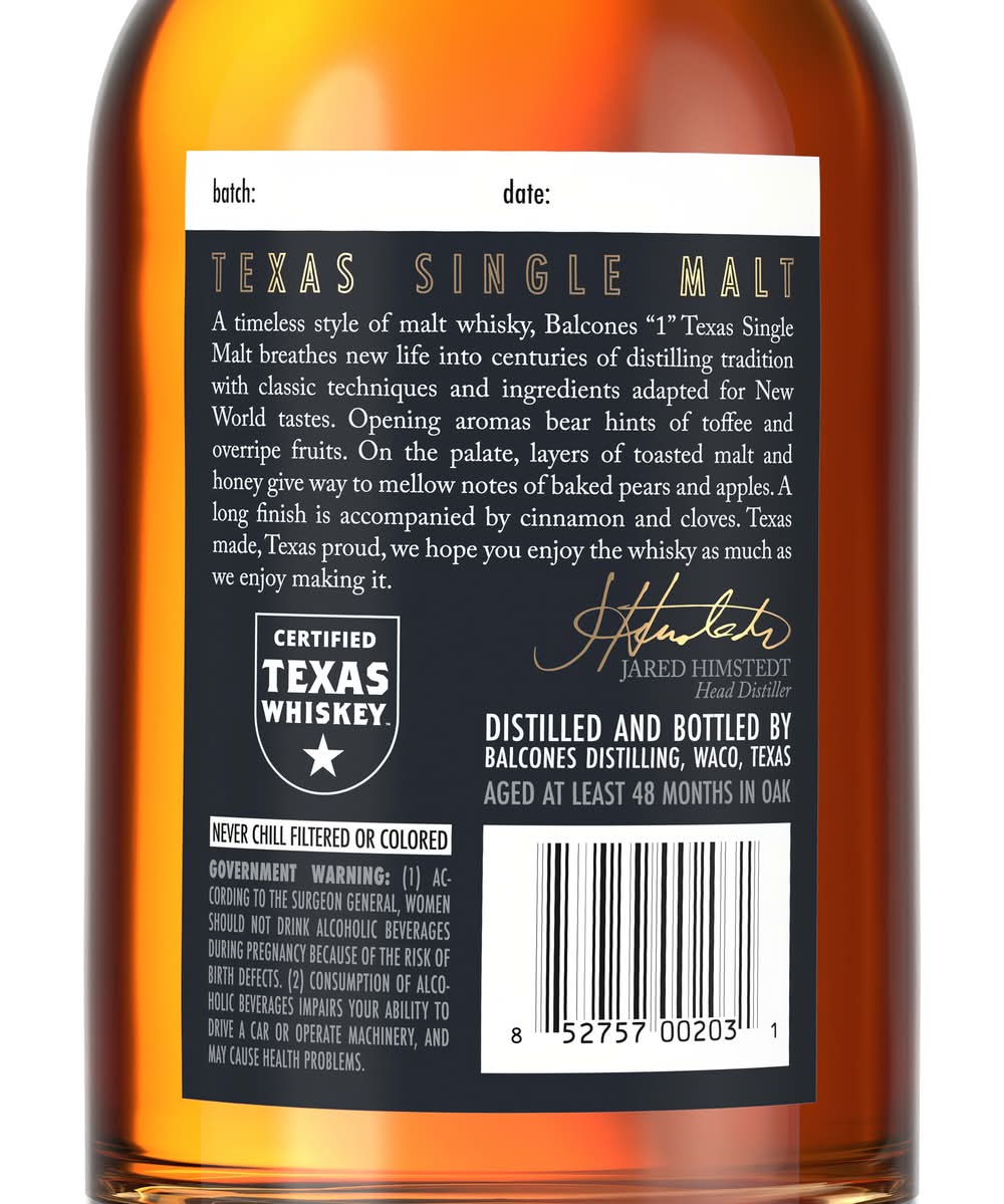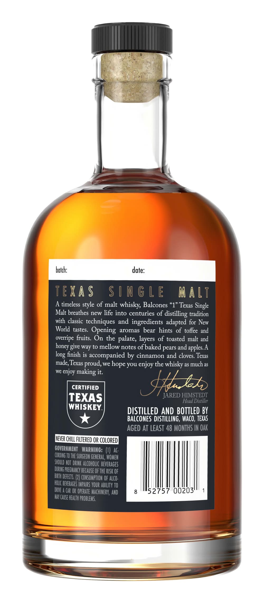 Savor the flavor of a Texas-made whisky created with a pioneering spirit with Balcones '1' Texas Single Malt Whisky. On the palate are rich flavors of toasted bread with fresh butter and marmalade with a long, lingering finish of toast, burnt sugar notes, and wood. This whisky is made with 100% Scottish Golden Promise malted barley and has matured over 24 months in 99% New American Oak and a sprinkling of New French and European Oak barrels. Best enjoyed neat or on the rocks. Includes one 106 proof 750 mL bottle of Balcones '1' Texas Single Malt Whisky. Please drink responsibly. Alcohol by volume: 53%