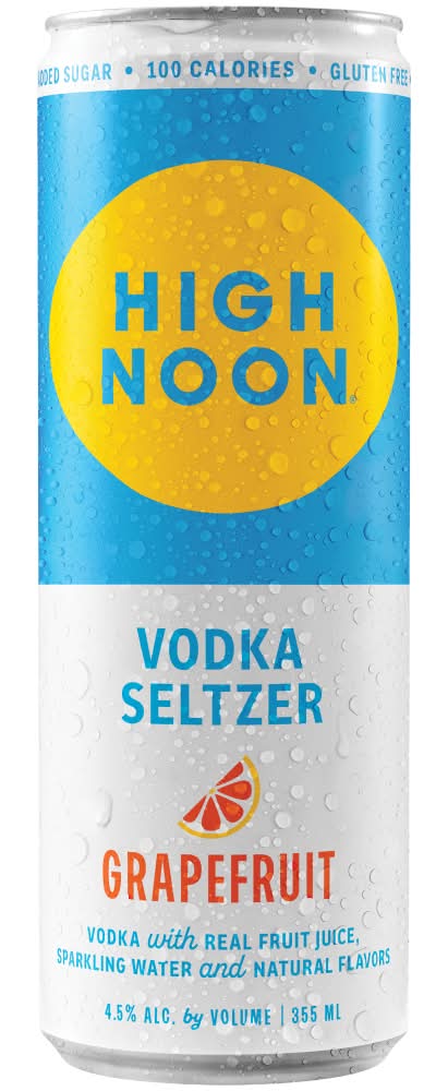 Live like the sun's out with High Noon Grapefruit Vodka Seltzer. Made with real vodka & real juice, sparkling water and natural flavors, this citrus hard seltzer offers tasting notes of juicy grapefruit with hints of sweet ruby red grapefruit flavor in a crisp, lively, sparkling drink. With 100 calories, this hard seltzer is gluten free with no added sugar. Just toss these cans in the cooler or the fridge for convenient drinks during your next sunny adventure. High Noon Hard seltzer is perfect when sipped ice cold at a backyard barbecue, pool party or a day at the beach. Each can has 4.5% alcohol by volume. • Flavor: Grapefruit • Alcohol by volume: 4.5%