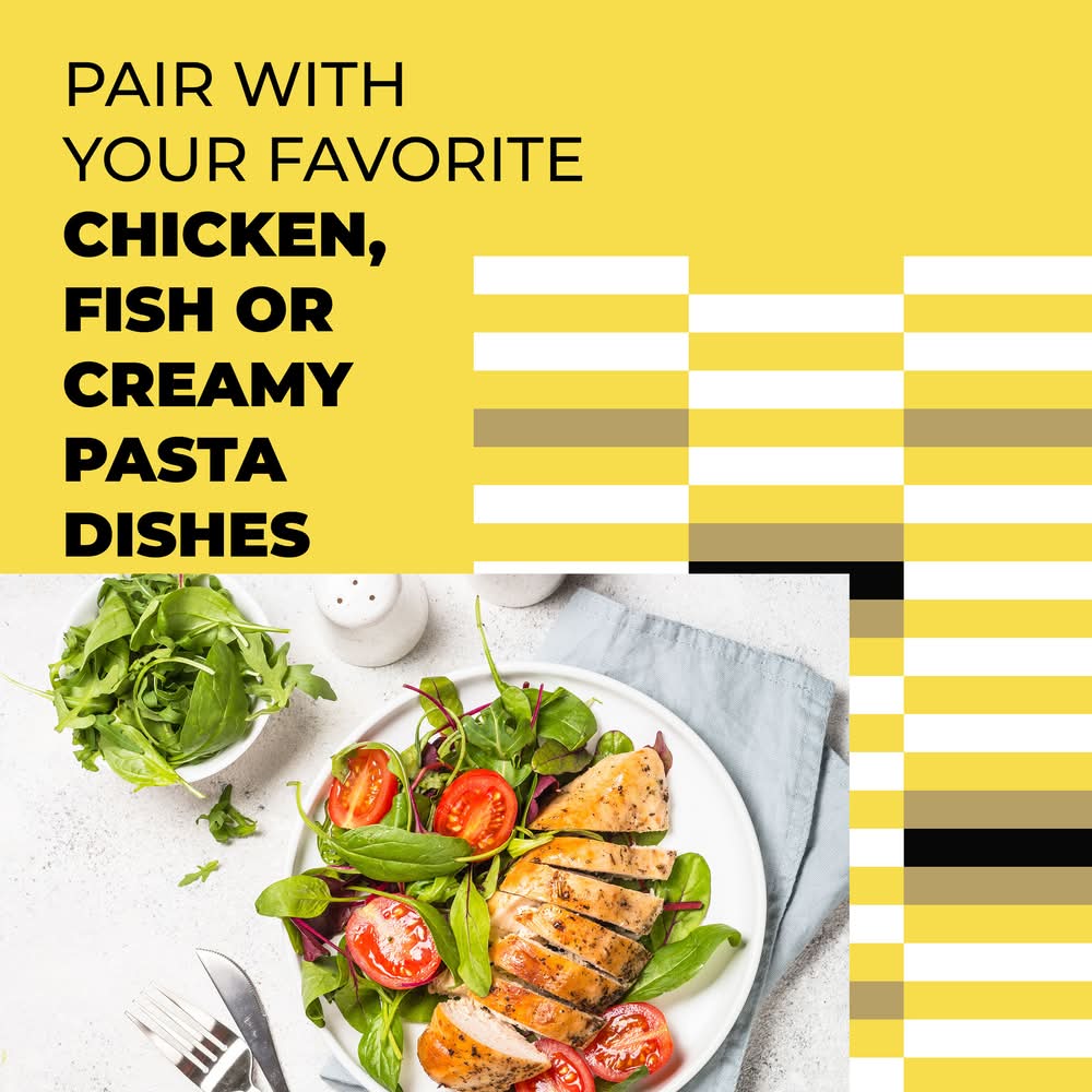 Enjoy a glass chilled by itself, or pair with your favorite chicken, fish or creamy pasta dishes. pairs well with: lemon butter fish, creamy pasta & herb-roasted chicken. over 40 years of winemaking dedication. government warning: (1) according to the surgeon general, women should not drink alcoholic beverages during pregnancy because of the risk of birth defects. (2) consumption of alcoholic beverages impairs your ability to drive a car or operate machinery, and may cause health problems.