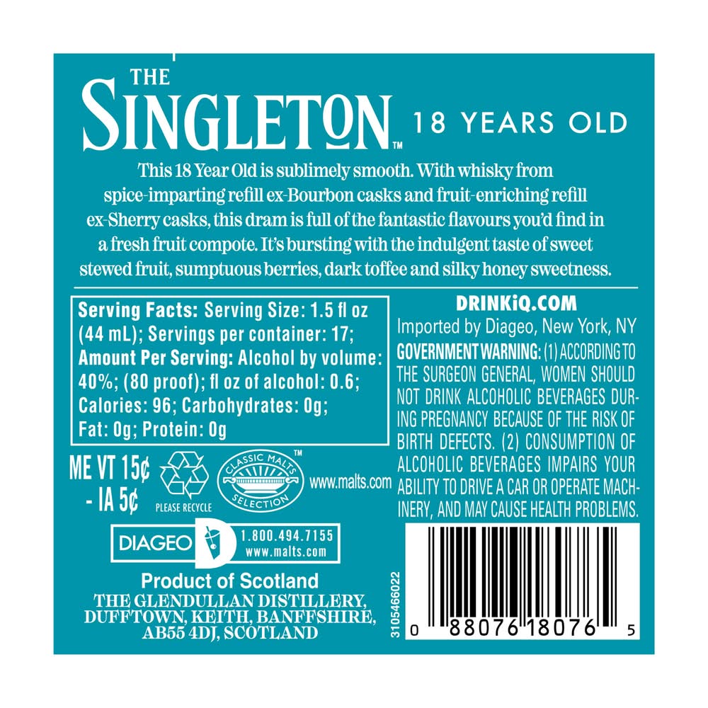 The driest and most mature malt in the Singleton of Glendullan stable, The Singleton 18 Year Old Single Malt Scotch Whisky, has a clear structure yet still retains its central core of sweet fruit. Very soft with a smooth texture, our aged single malt boasts a fresh acidity that deepens into a rich spicy note of herbs. Adding a splash of water allows a pleasant nutty spiciness to come through, enhancing this Speyside’s clean and elegant nature. American Oak brings subtle, honeyed hints to The Singleton of Glendullan range, with a touch of European Oak offering a balancing dryness. Delicious however you choose to drink it, our award-winning 80 proof whisky is best enjoyed in the company of friends and in mixed drinks. Simply serve in a rocks glass, neat or with a drop water. The Singleton of Glendullan 18 Year Old Single Malt Scotch Whisky was awarded a Double Gold medal two years in a row in 2021 and 2020 at the San Francisco World Spirits Competition. Includes one 80 proof 750 mL bottle of 18 Year Old Single Malt Scotch Whisky. Please drink responsibly. Alcohol by volume: 40%