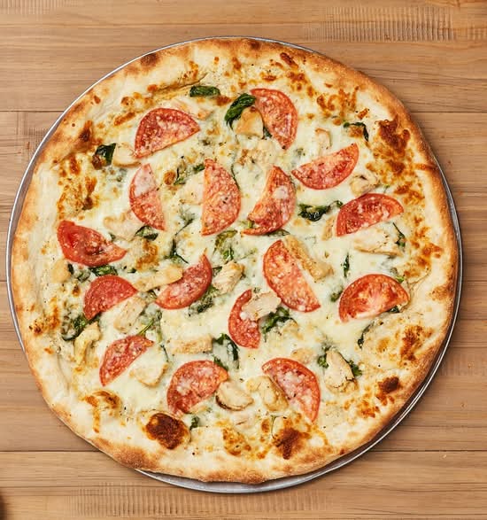 Our white pizza with grilled chicken, sliced tomatoes & fresh spinach.