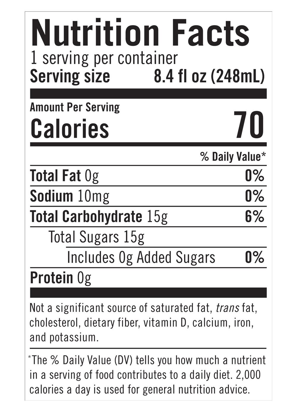 Flavored juice beverage blend from concentrate with other natural flavors. 70 calories per can. No added sugar (not a low calorie food. See nutrition panel for information on sugar and calorie content). Non-gmo project verified. • Flavor: Apple • Pack size: 24 • Number of servings: 1 • Packaging: Reusable
