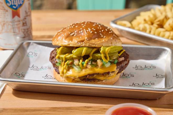 Two Beef Patties, American Cheese, Onion, Tomato, Relish, Pickles, Sport Peppers, & Mustard On A Sesame Brioche Bun. Includes Side of Waffle Fries!