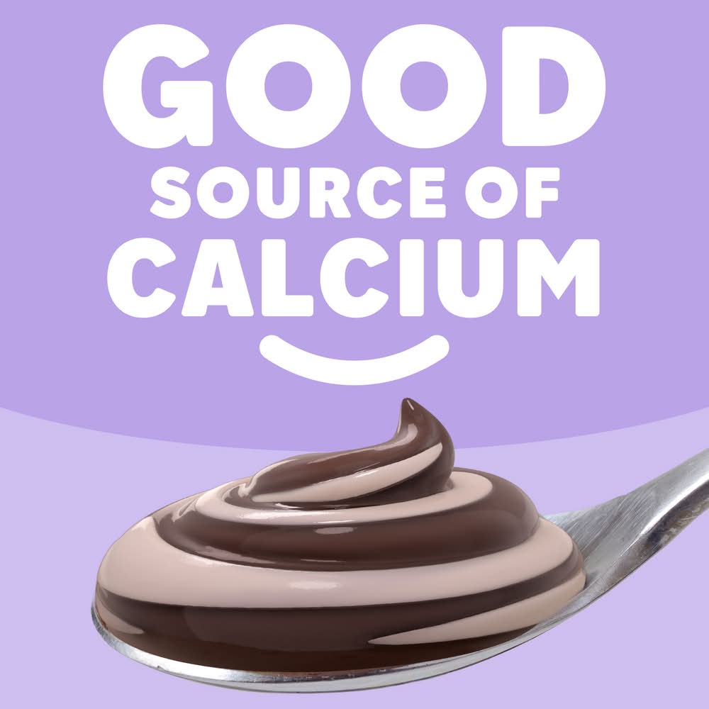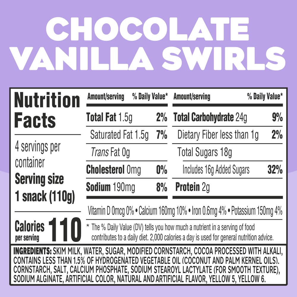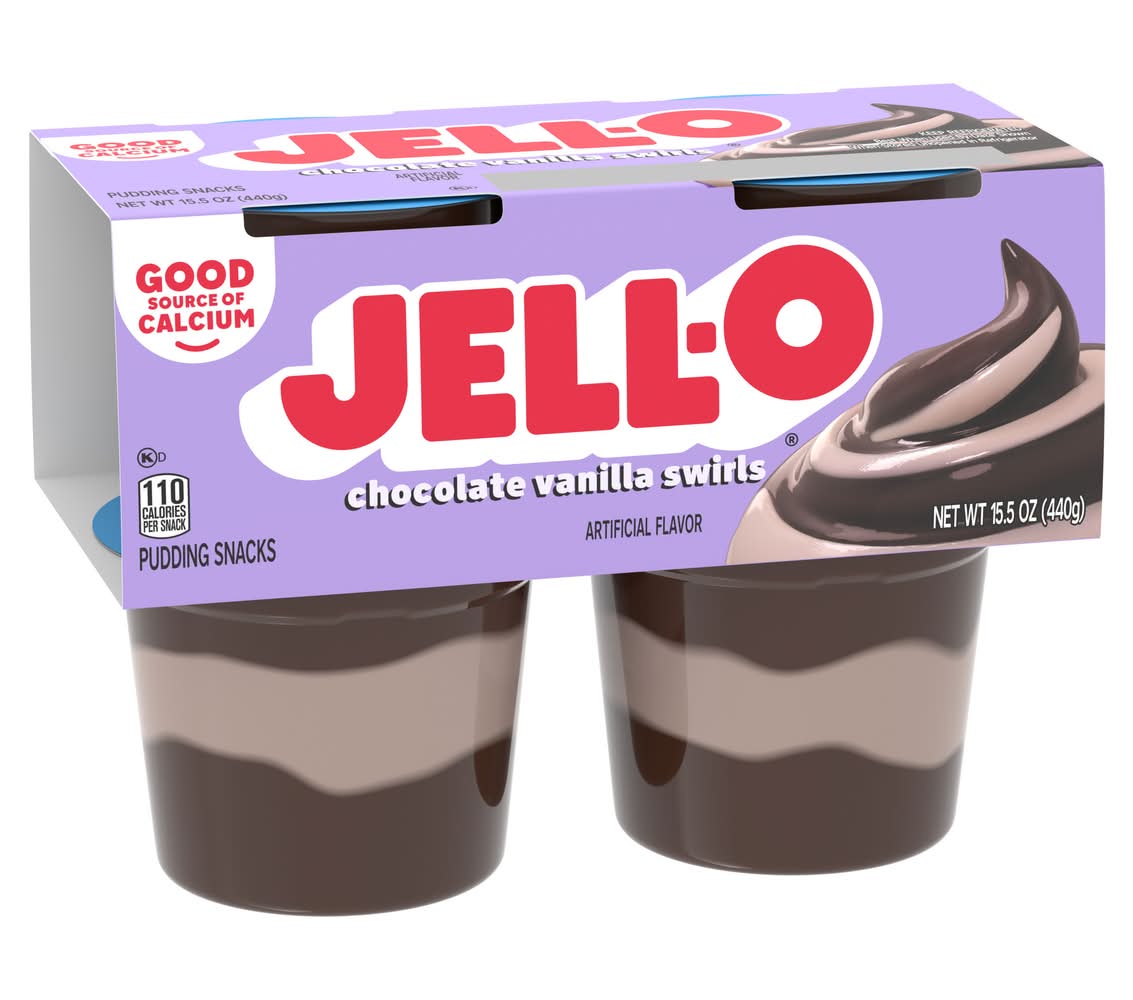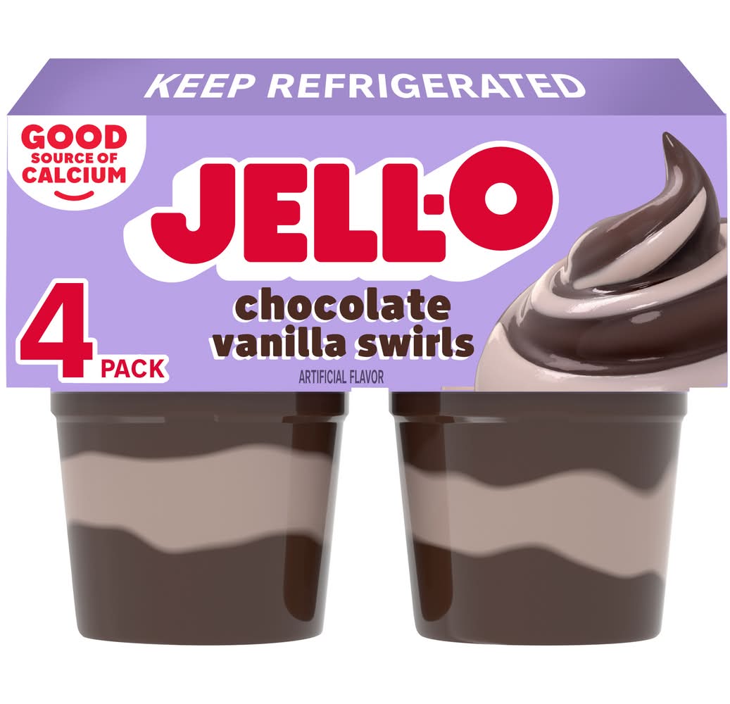 Snack happy. Jell-O Original Chocolate Vanilla Swirls Artificially Flavored Ready-to-Eat Pudding Snack Cups are a delicious, ready-to-eat, on-the-go snack. Enjoy pudding fun in every bite with our individual snack cups that are perfect for packing in a lunchbox, eating on the go or snacking at home. Add some wonder to your day with a delicious, convenient snack. Made with milk, our artificially flavored vanilla and chocolate swirl pudding cups are a good source of calcium. Each pudding snack contains 110 calories per serving. Each 15.5-ounce sleeve contains four chocolate vanilla swirl artificially flavored pudding cups for quick and easy snacking. Spoon up a smile with Jell-O Original Chocolate Vanilla Swirls Ready-to-Eat Pudding Cups. • Flavor: Chocolate-vanilla • Number of servings: 4 • Kraft Heinz Foods Company, Chicago, IL, 60601.