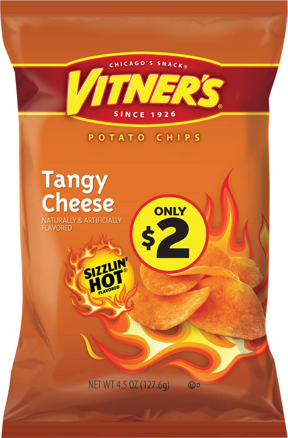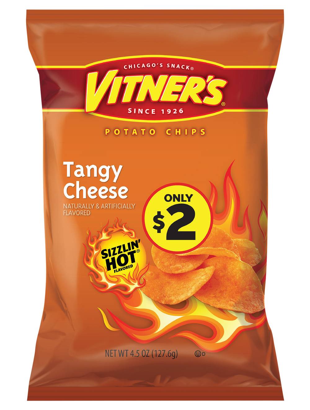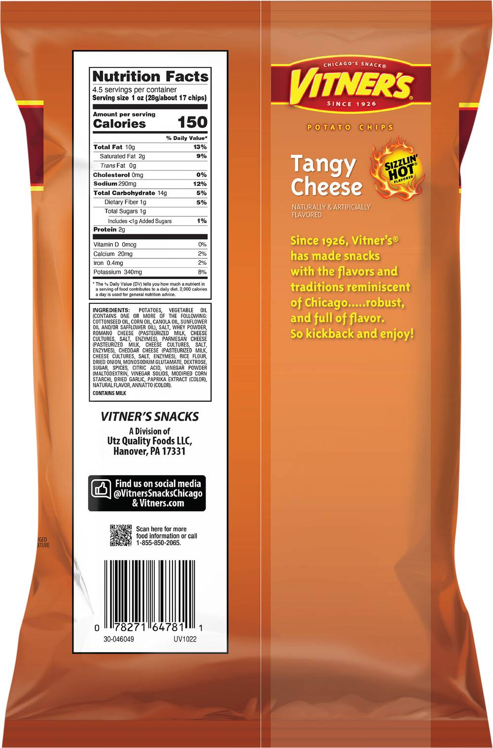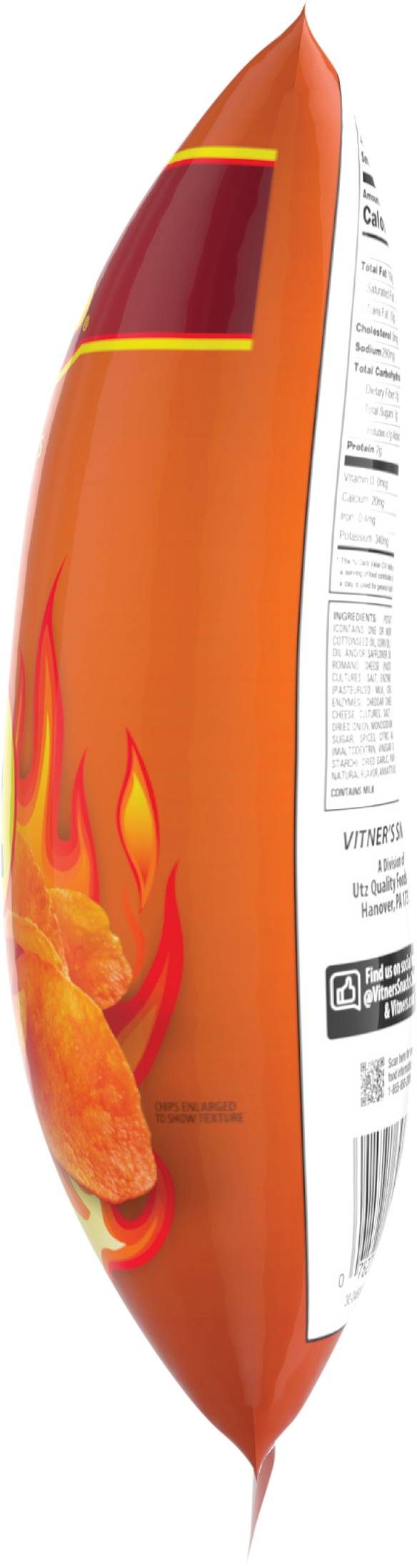 Naturally & artificially flavored. Sizzlin' hot flavored. Chicago's snack. Since 1926. Only 2$. Since 1926, Vitner's has made snacks with the flavors and traditions reminiscent of Chicago. Robust, and full of flavor. So kickback and enjoy! vitners.com. Facebook. Find us on social media (at)VitnersSnacksChicago & vitners.com. Scan here for more food information or call 1-855-850-2065.