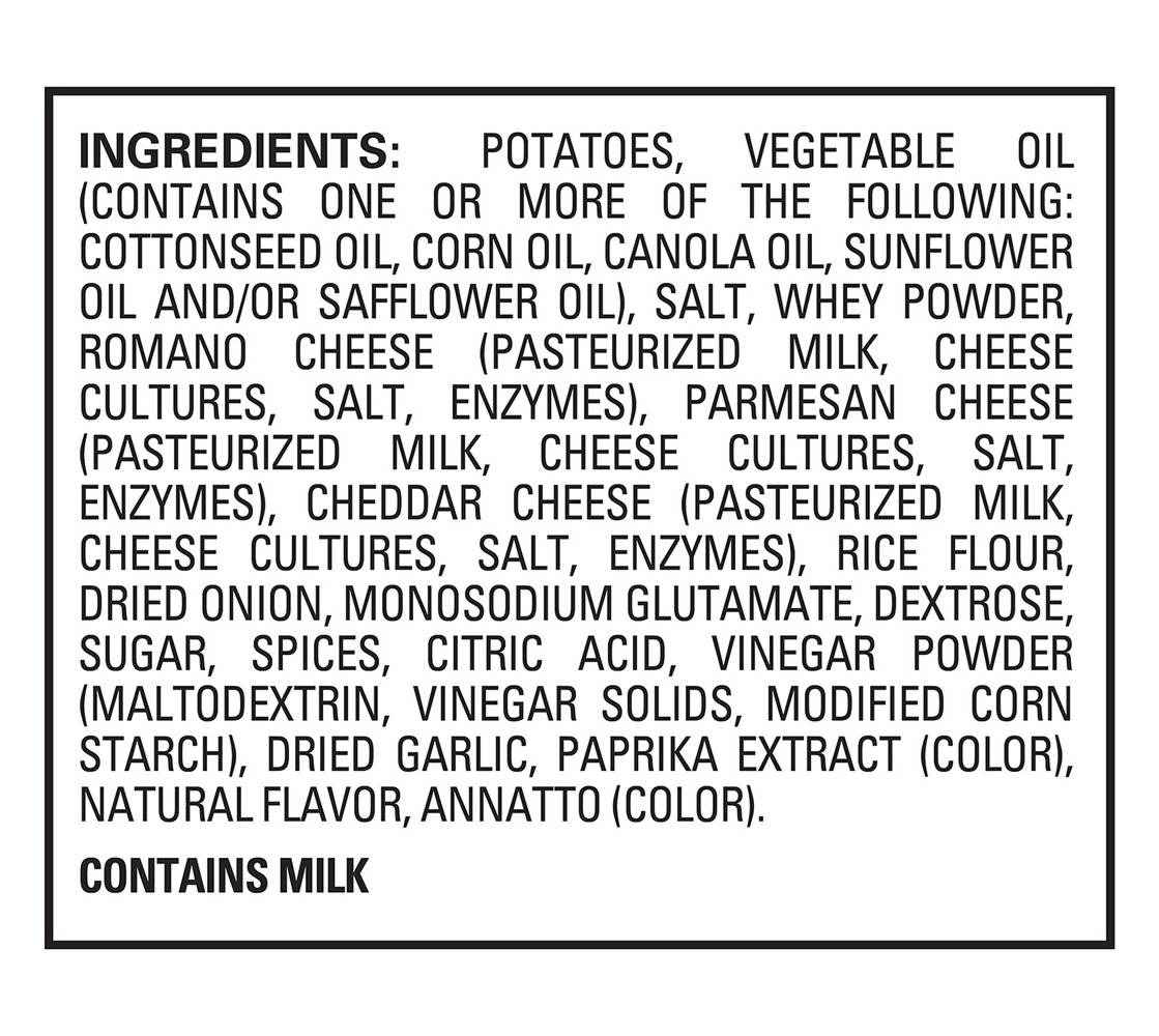 Ingredients: Potatoes, Vegetable Oil (Contains One or More of the Following: Cottonseed Oil Corn Oil Canola Oil Sunflower Oil and/or Safflower Oil), Salt, Whey Powder, Romano Cheese (Pasteurized Milk Cheese Cultures Salt Enzymes), Parmesan Cheese (Pasteurized Milk Cheese Cultures Salt Enzymes), Cheddar Cheese (Pasteurized Milk Cheese Cultures Salt Enzymes), Rice Flour, Dried Onion, Monosodium Glutamate, Dextrose, Sugar, Spices, Citric Acid, Vinegar Powder (Maltodextrin Vinegar Solids Modified Corn Starch), Dried Garlic, Paprika Extract (Color), Natural Flavor, Annatto (Color) Contains: Milk, Corn