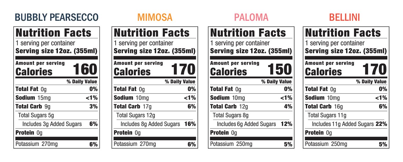Ingredients: Bellini: Hard Cider, Less than 1% of: Natural Flavor, Citric Acid, and Sulfites, Lightly Carbonated. Paloma: Hard Cider, Less than 1% of: Natural Flavors, Citric Acid, Purple Carrots for Color, and Sulfites, Lightly Carbonated. Mimosa: Hard Cider, Orange Juice from Concentrate, Less than 1% Natural Flavors, Citric Acid and Sulfites, Lightly Carbonated. Bubbly Pearsecco: Hard Cider, Pear Juice from Concentrate, Less than 1% of Citric Acid, Natural Flavor and Sulfites, Carbonated Contains: Sulfites