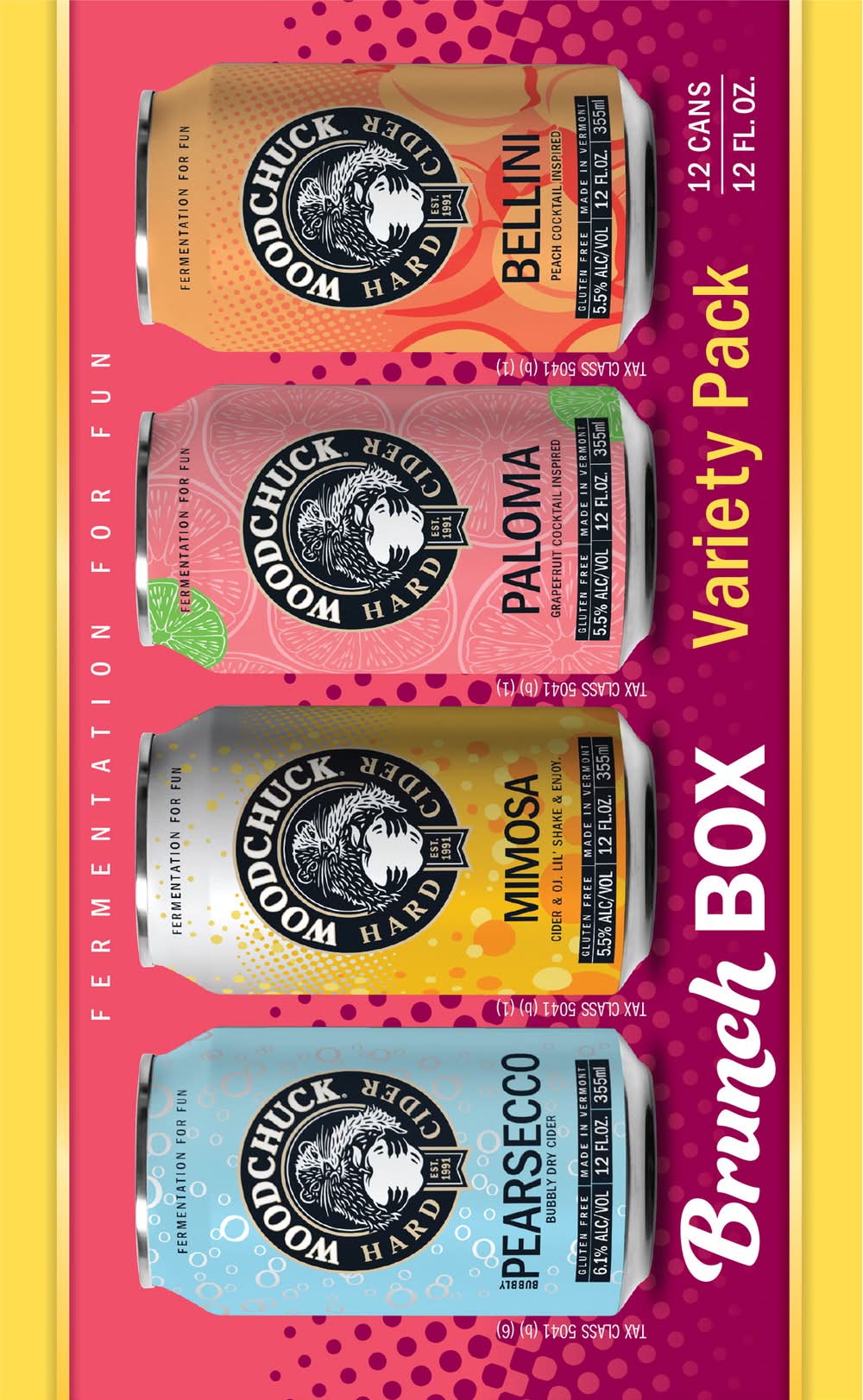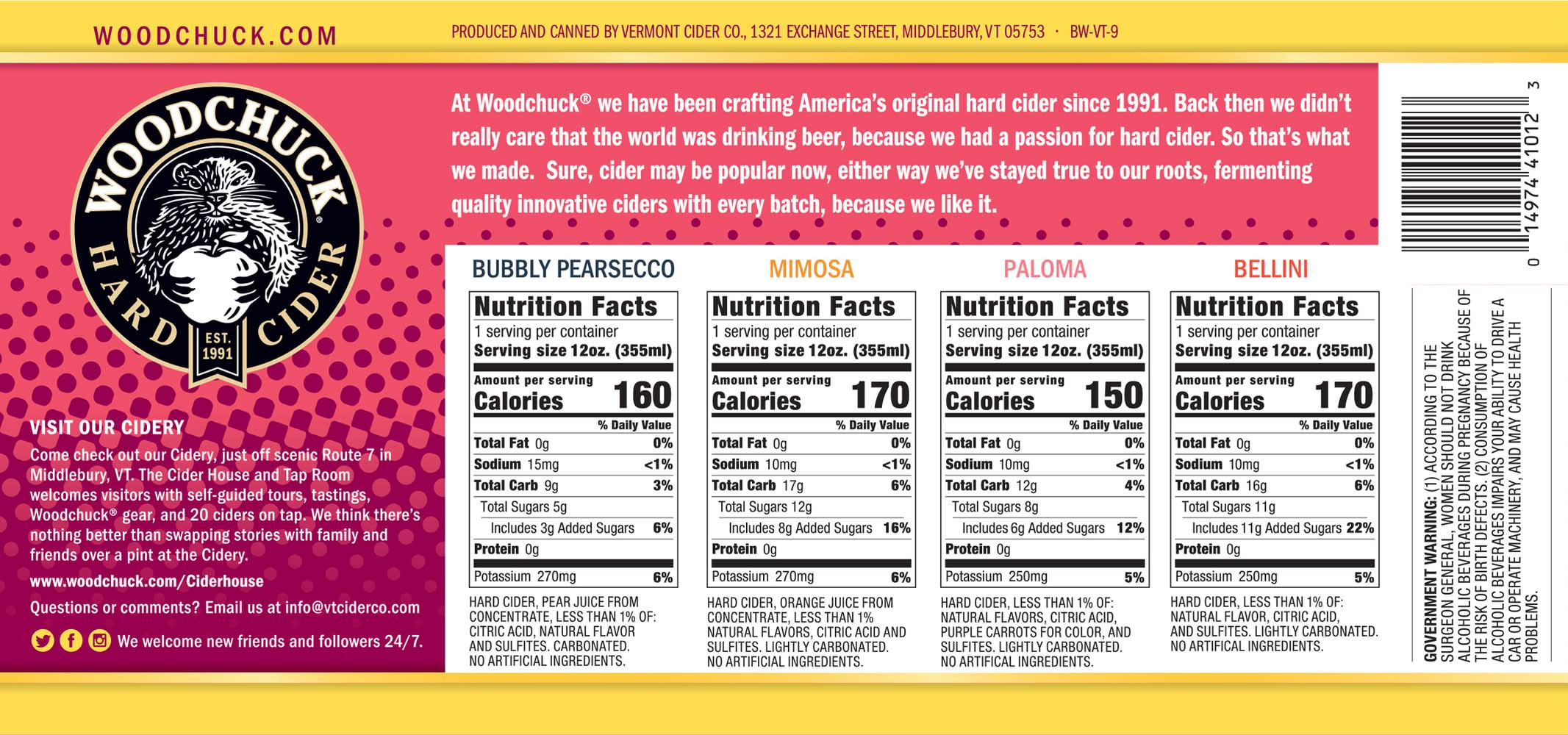 Bubbly Pearsecco: Bubbly dry cider. Mimosa: Cider & OJ. JIL shake & enjoy. Paloma: Grapefruit cocktail inspired. Bellini: Peach cocktail inspired. Fermentation for fun. 3 cans of each style. Est. 1991. At Woodchuck we have been crafting America's original hard cider since 1991. Back then we didn't really care that the world was drinking beer, because we had a passion for hard cider. So that's what we made. Sure, cider may be popular now, either way we've stayed true to our roots, fermenting quality innovative ciders with every batch, because we like it. Visit our cidery. Come check out our Cidery, just off scenic Route 7 in Middlebury, VT. The Cider House and Tap Room welcome visitors with self-guided tours, tastings, Woodchuck gear, and 20 ciders on tap. We think there's nothing better than swapping stories with family and friends over a pint at the Cidery. www.woodchuck.com/ciderhouse. woodchuck.com. We welcome new friends and followers 24/7. Twitter. Facebook. Instagram. Questions or comments? Email us at info(at)vtciderco.com. Bubbly Pearsecco: 6.1% Alc/Vol. Mimosa: 5.5% Alc/Vol. Paloma: 5.5% Alc/Vol. Bellini: 5.5% Alc/Vol. Made in Vermont. Produced and canned by Vermont Cider Co., 1321 exchange street, Middlebury, VT 05753. • Pack size: 12 • Alcohol by volume: 6.1% • Number of servings: 1