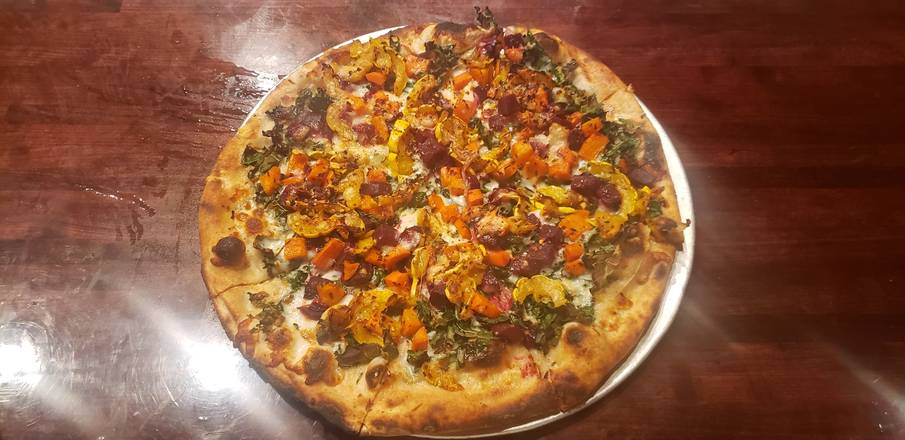 Garlic Sauce, Kale, Roasted Carrots, Orange Zested Roasted Beets, Roasted Delicata Squash, Chili Flakes, Lemon Zest, Mozzarella and Asiago