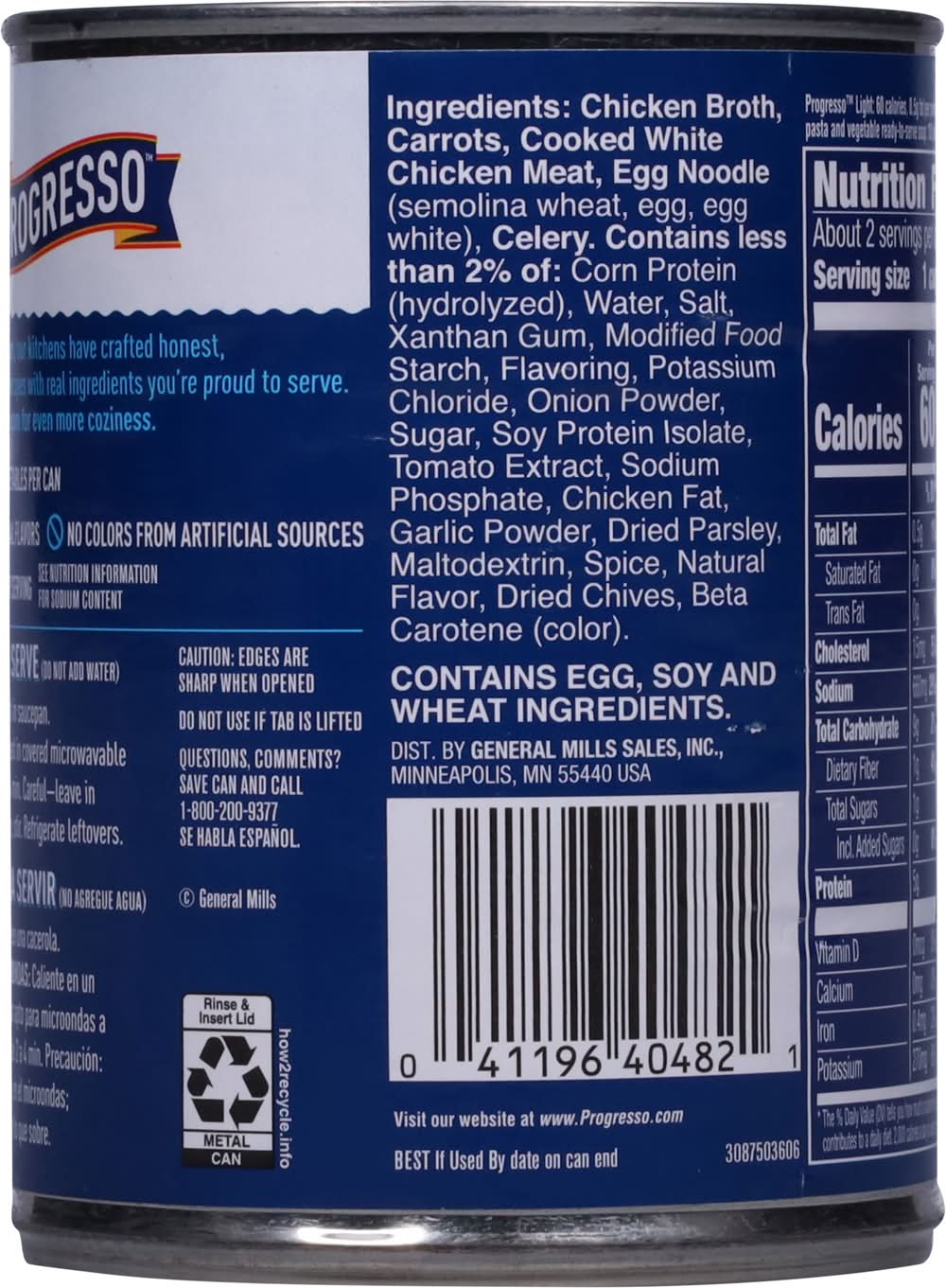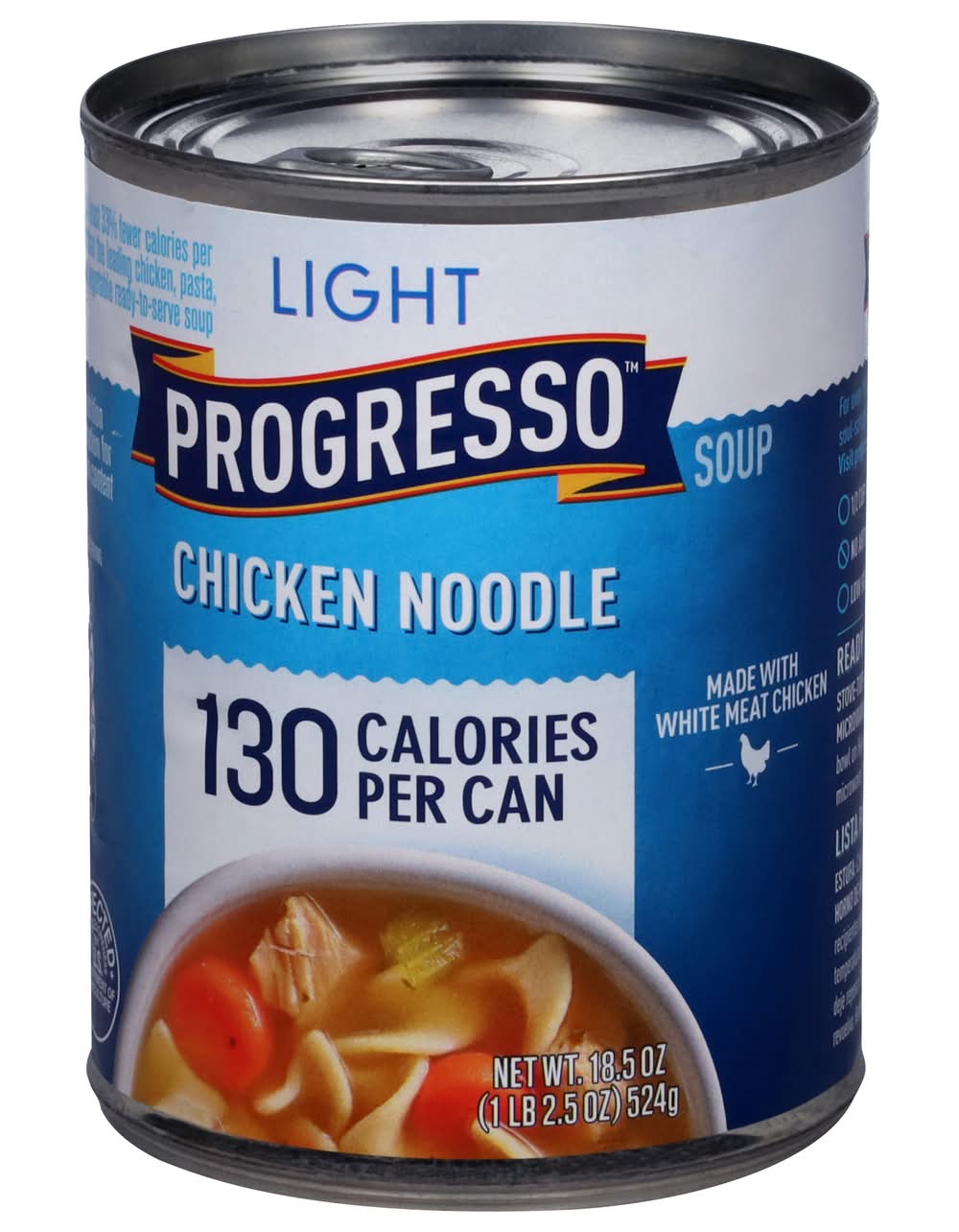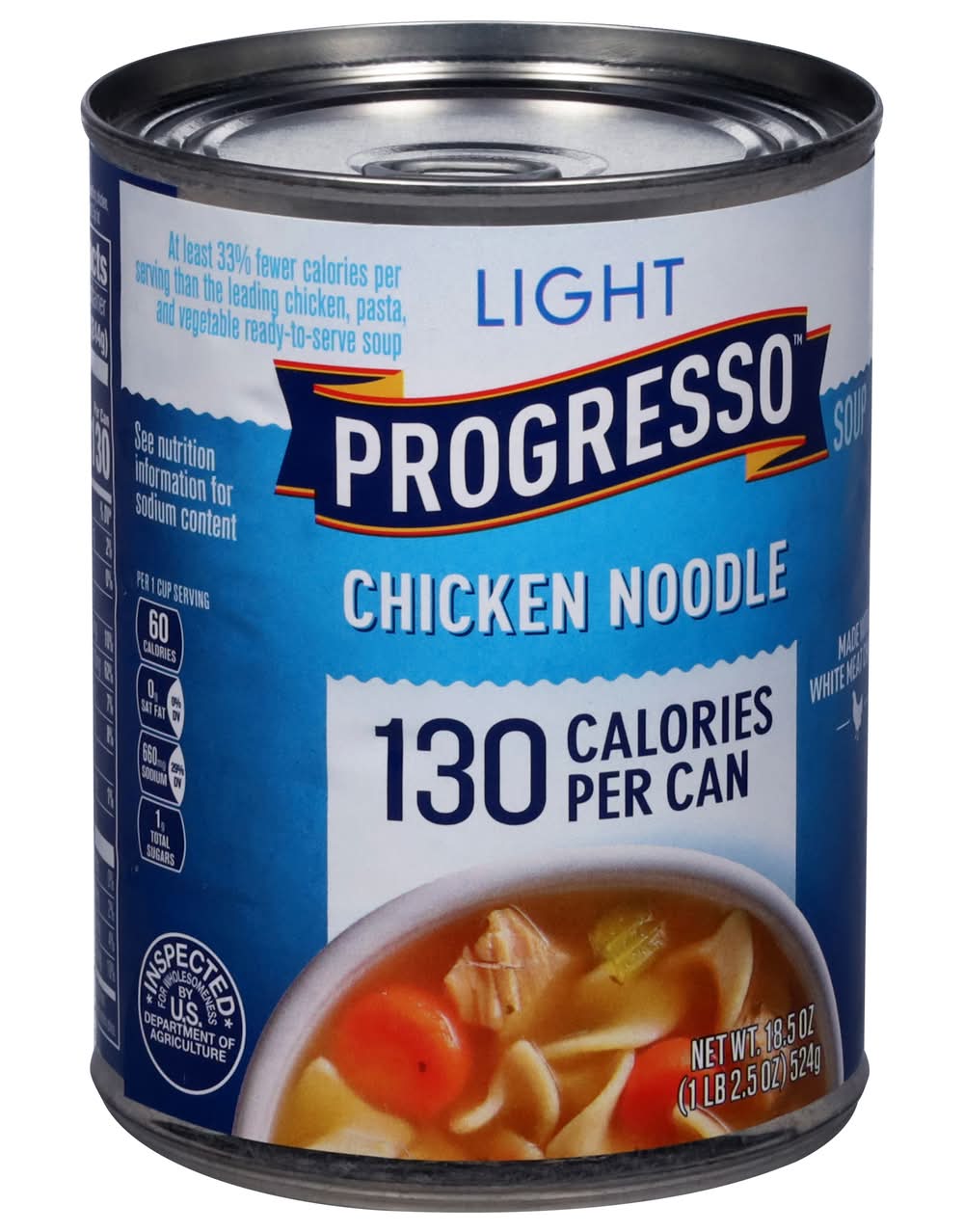 Like our original recipe, Progresso Light Chicken Noodle Soup features chicken broth, carrots, tender chunk white meat chicken, and egg noodle. Our light recipe alternative is 130 calories per can - at least 33% fewer calories per serving than the leading chicken, pasta, and vegetable ready-to-serve soup. This Progresso Soup contains no artificial flavors and no colors from artificial sources - just the delicious taste you've come to expect from Progresso. Unlike instant ramen, Progresso soup is ready to serve, no need to add water. Serve it in minutes by following the easy warming direction on the can. Try a bowl alongside a toasted sandwich or fresh bread as part of lunch or dinner. About two servings per can. At Progresso, we're passionate about making great products. We've been creating soups ranging from Chicken Noodle to Tomato Basil and beyond for more than 100 years. And today, Progresso still uses quality ingredients for enticing flavor found in our line of canned soup products. • General mills sales, inc., Minneapolis, MN, 55440 • Packaging: Reusable