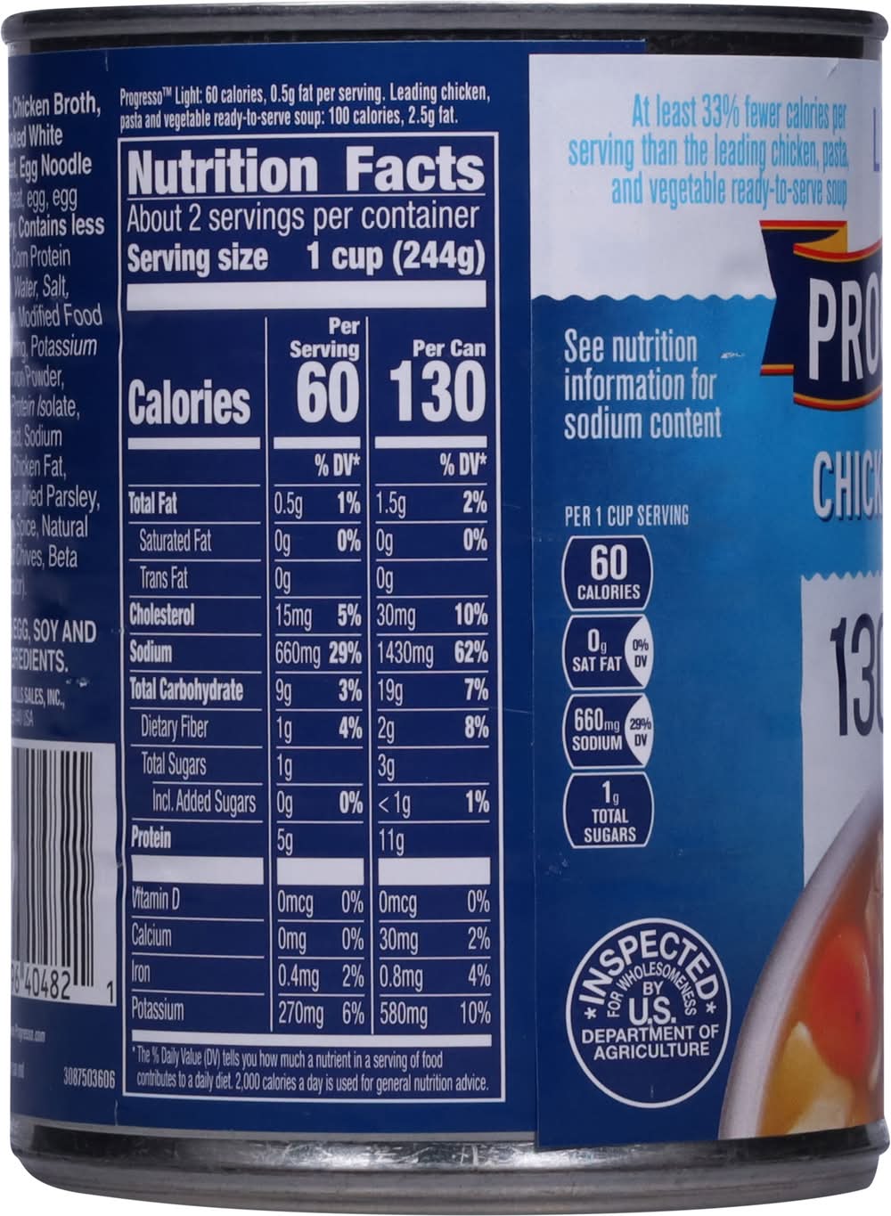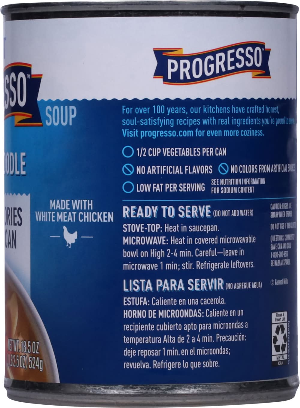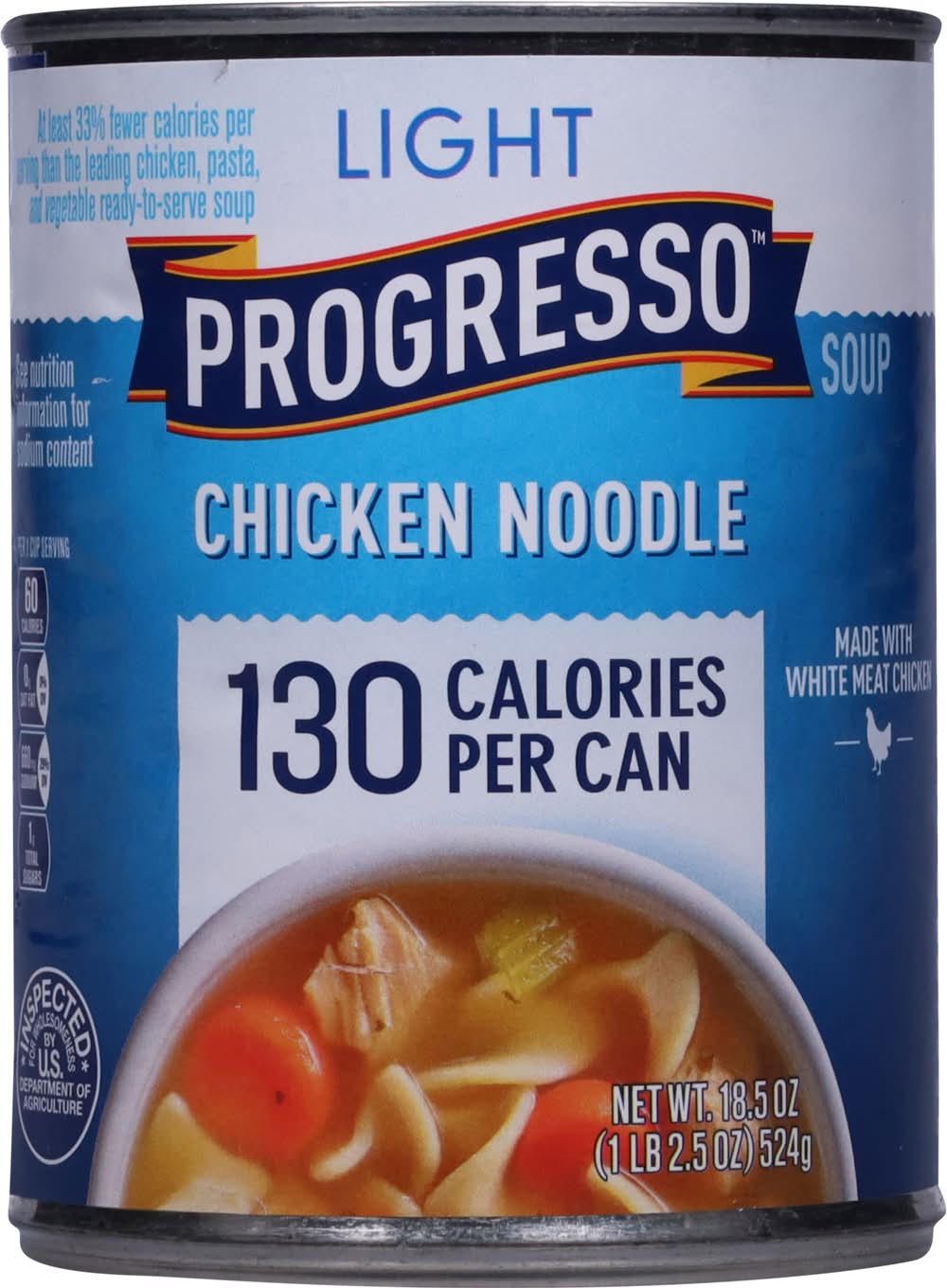 Like our original recipe, Progresso Light Chicken Noodle Soup features chicken broth, carrots, tender chunk white meat chicken, and egg noodle. Our light recipe alternative is 130 calories per can - at least 33% fewer calories per serving than the leading chicken, pasta, and vegetable ready-to-serve soup. This Progresso Soup contains no artificial flavors and no colors from artificial sources - just the delicious taste you've come to expect from Progresso. Unlike instant ramen, Progresso soup is ready to serve, no need to add water. Serve it in minutes by following the easy warming direction on the can. Try a bowl alongside a toasted sandwich or fresh bread as part of lunch or dinner. About two servings per can. At Progresso, we're passionate about making great products. We've been creating soups ranging from Chicken Noodle to Tomato Basil and beyond for more than 100 years. And today, Progresso still uses quality ingredients for enticing flavor found in our line of canned soup products. • General mills sales, inc., Minneapolis, MN, 55440 • Packaging: Reusable