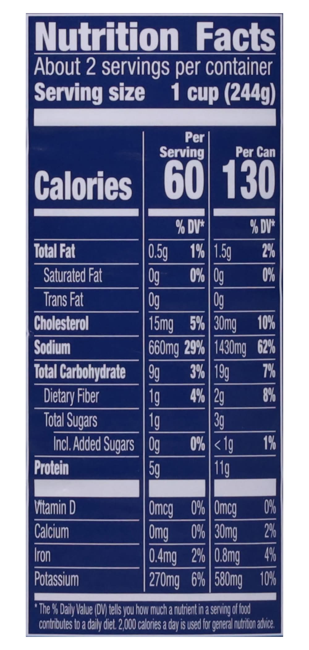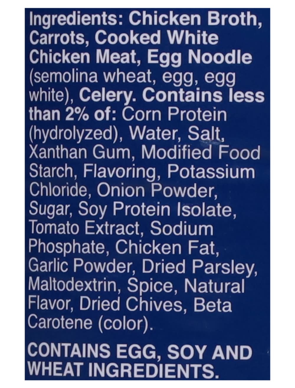 Ingredients: Chicken Broth, Carrots, Cooked White Chicken Meat, Egg Noodle (Semolina Wheat, Egg, Egg White), Celery, Contains Less than 2% of: Corn Protein (Hydrolyzed), Water, Salt, Xanthan Gum, Modified Food Starch, Flavoring, Potassium Chloride, Onion Powder, Sugar, Soy Protein Isolate, Tomato Extract, Sodium Phosphate, Chicken Fat, Garlic Powder, Dried Parsley, Maltodextrin, Spice, Natural Flavor, Dried Chives, Beta Carotene (Color) Contains: Eggs, Wheat, Soybeans, Celery