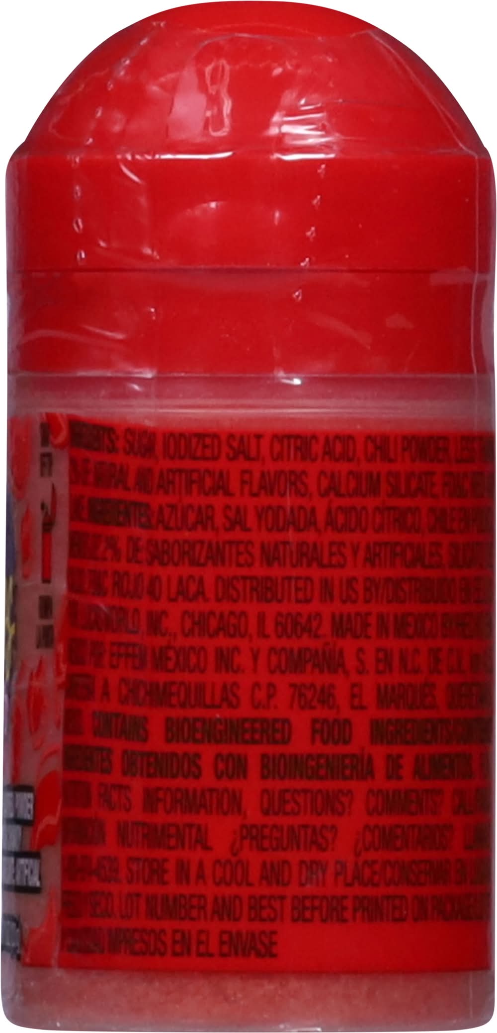 Ingredients: Sugar, Iodized Salt, Citric Acid, Chili Powder, Less than 2% of: Natural and Artificial Flavors, Calcium Silicate, FD&C Red 40 Lake