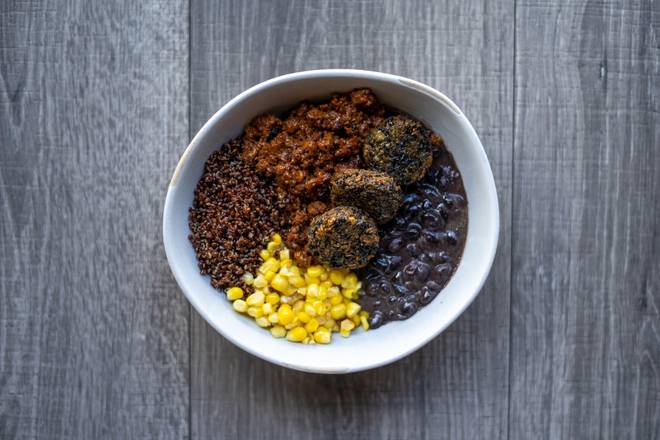 red quinoa, coconut black beans, shiitake mushrooms, impossible chorizo, corn, salsa roja