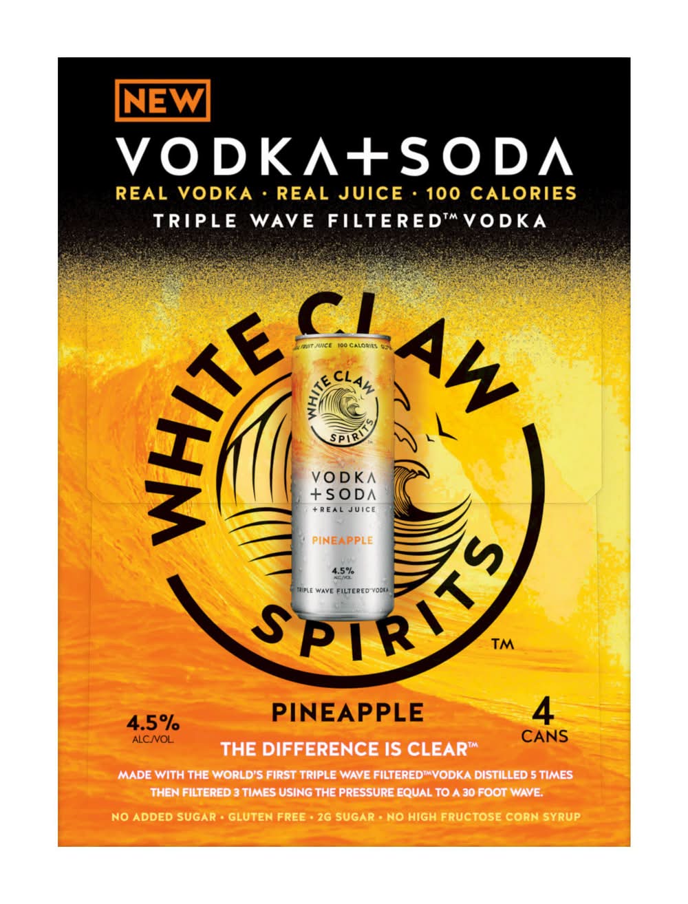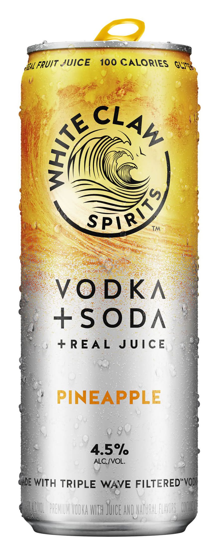 WHITE CLAW™ SPIRITS VODKA + SODA PINEAPPLE 12 FL OZ CAN White Claw® Pineapple Vodka + Soda. Born from the new wave of vodka. The world’s first Triple Wave Filtered vodka collides with freshly cut pineapple flavor – vibrant and tropical that hits the sweet spot just right. Together, delivering unrivalled taste refreshment with a smoother, superior finish. Best served cold, crack it open at your next open-air gig. • Pack size: 4 • Alcohol by volume: 4.5% • Packaging: Reusable