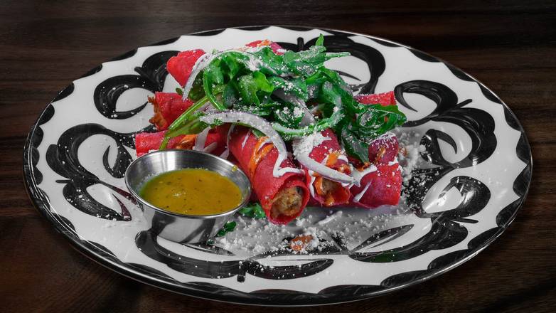 5 rolled taquitos-chicken tinga or potato-arugula mix-chile de árbol dip-cotija cheese-habanero salsa