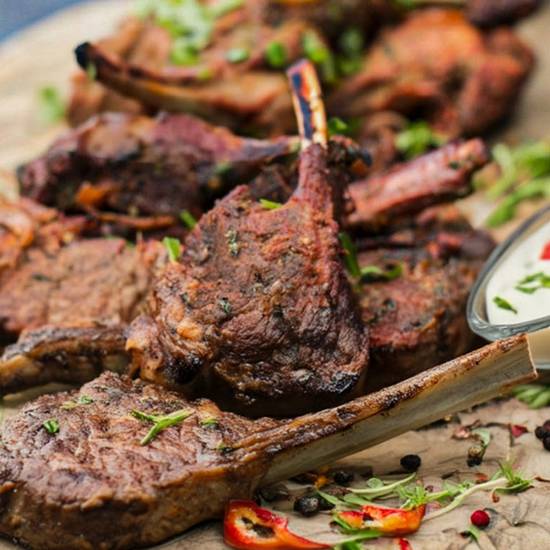 2 lamb chops & Indian spiced minced lamb skewers. GF, DF, contains eggs