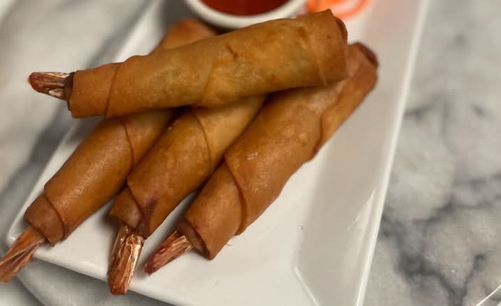 Crispy tiger shrimp wrapper in spring roll wrapper and stuffed with celery, carrot, and cabbage. Served with sweet and sour sauce. Three pieces.