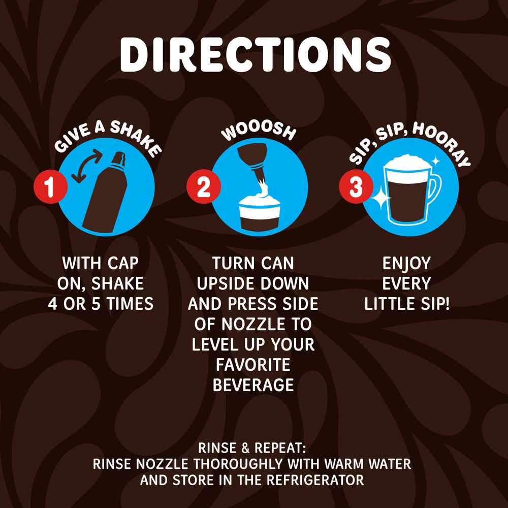 1) fill a l2 oz mug with coffee made to your liking, save room for foam! (2) shake can well 4 times before use then remove cap. (3) turn can completely upside down & press nozzle sideways with finger to fill mug to the top. (4) rinse nozzle thoroughly with warm water & replace in refrigerator. barista tip: when making multiple beverages, replace the cap and shake between each drink. reddi wip directions: 1-fill a 12 oz mug with coffee made to your liking, save room for foam! 2- shake can well 4 times before use then remove cap. 3- turn can completely upside down & press nozzle sideways with finger to fill mug to the top. 4-rinse nozzle thoroughly with warm water & replace in refrigerator. 3/4. important: must be kept refrigerated to maintain safety. will stay freshest when stored at normal refrigerator temperatures of 35 degrees to 40 degrees f. freezing is not recommended. sell by date printed on bottom of can.