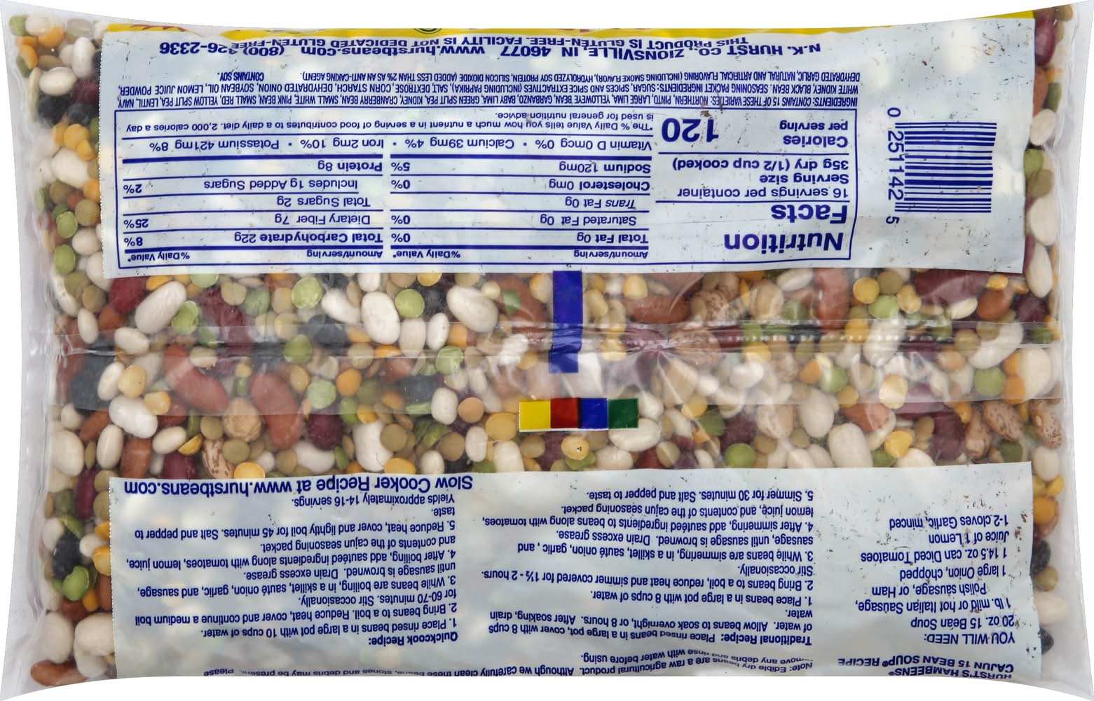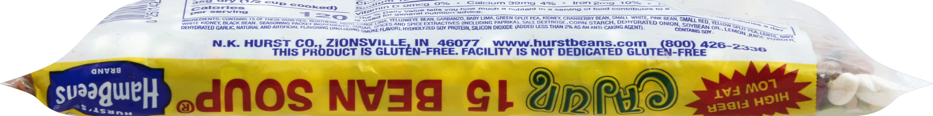 Ingredients: Contains 15 of These Varieties: Northern, Pinto, Large Lima, Yelloweye Bean, Garbanzo, Baby Lima, Green Split Pea, Kidney, Cranberry Bean, Small White, Pink Bean, Small Red, Yellow Split Pea, Lentil, Navy, White Kidney, Black Bean, Seasoning Packet Ingredients: Sugar, Spices and Spice Extractives (Including Paprika), Salt, Dextrose, Corn Starch, Dehydrated Onion, Soybean Oil, Lemon Juice Powder, Dehydrated Garlic, Natural and Artificial Flavoring (Including Smoke Flavor), Hydrolyzed Soy Protein, Silicon Dioxide (Added Less than 2% as an Anti-Caking Agent) Contains: Soybeans