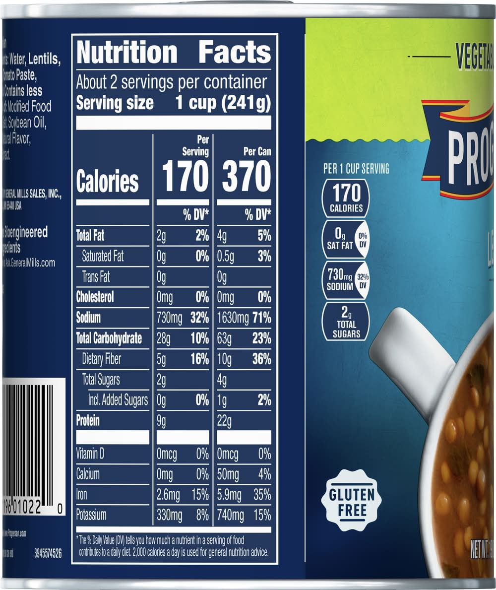 For over 100 years, our kitchens have crafted honest, soul-satisfying recipes with real ingredients you're proud to serve.for even more coziness. 1/2 cup of vegetables per serving. Excellent source of fiber. See nutrition information for sodium content. Exchanges: 1-1/2 starch, 1-1/2 vegetable. Based on Academy of Nutrition and Dietetics and American Diabetes Association criteria. Made in the USA. • Flavor: Lentil • General Mills Sales, Inc., Minneapolis,MN,55440,USA • Packaging: Reusable
