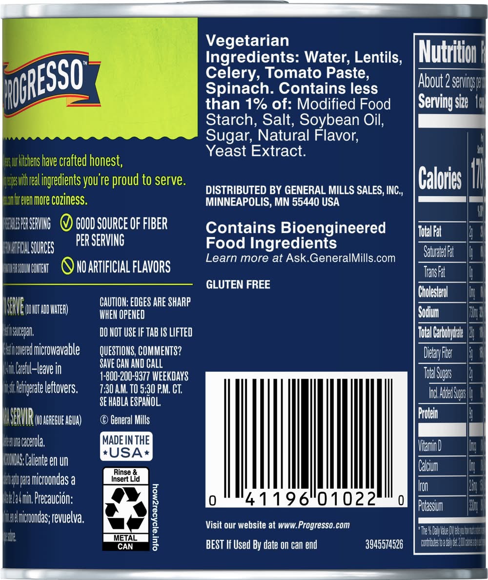 Ingredients: Water, Lentils, Celery, Tomato Paste, Spinach, Contains Less than 1% of: Modified Food Starch, Salt, Soybean Oil, Sugar, Natural Flavor, Yeast Extract Contains: Celery, Soybeans
