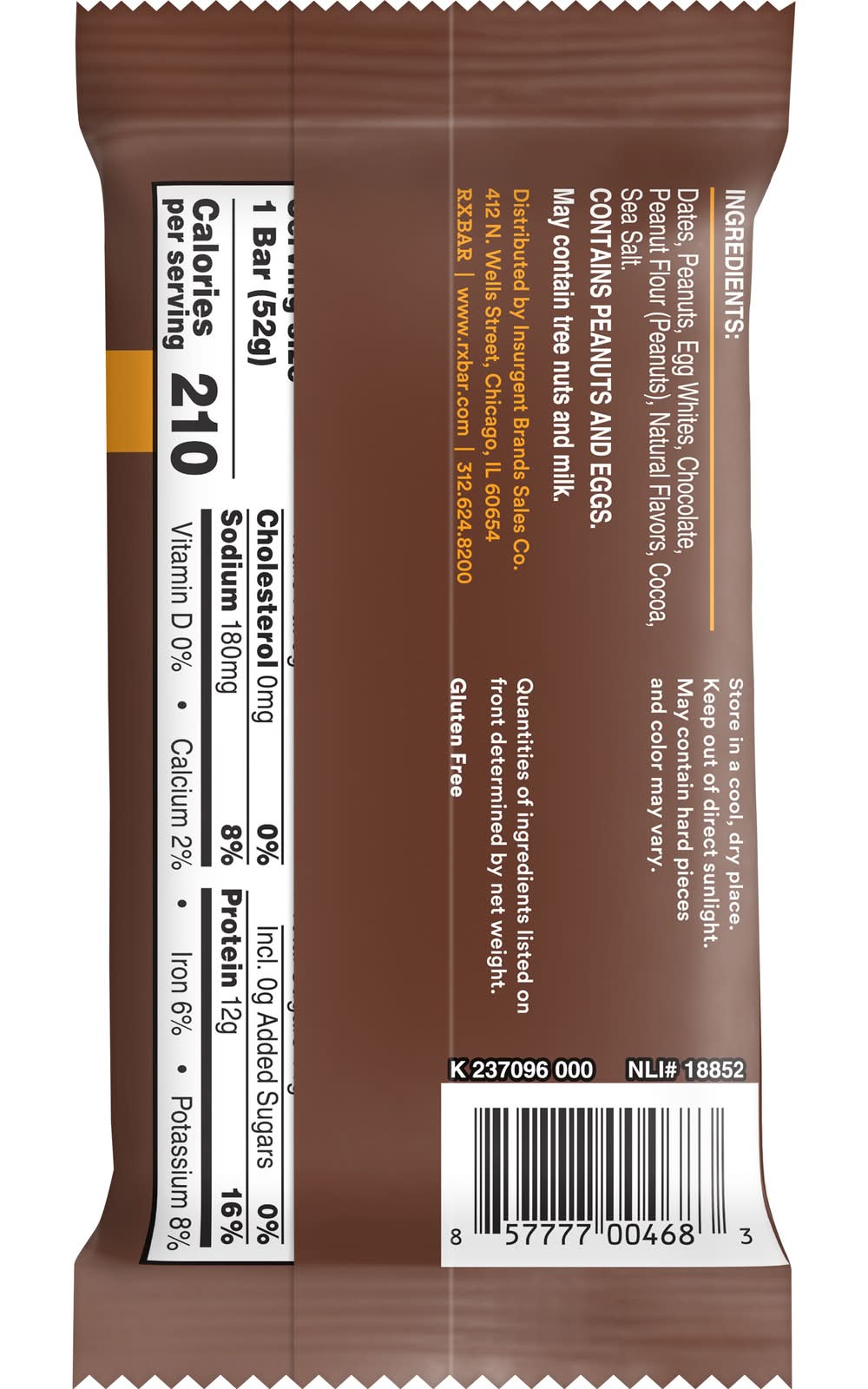 Simple, delicious ingredients make RXBAR protein bars a satisfying way to fuel your day. These wholesome peanut butter chocolate protein bars are filled with ingredients you can recognize. Each snack bar is made with egg whites for protein, crunchy peanuts, with dates to bind it all together. Enjoy the taste of simple ingredients that will crush any sweet cravings you have during the day; Just the right amount to fill you up, each serving contains 12g of protein (19% daily value), is gluten free, and ready to help you take on the day. Enjoy wholesome goodness worth snacking on. On your way to the gym, in the office or paired with your morning cup of joe, improve your daily routine with RXBAR Peanut Butter Chocolate protein bars. • Flavor: Peanut butter chocolate • Chicago Bar Company Llc, 412 N. Wells Street,Chicago,IL,60654