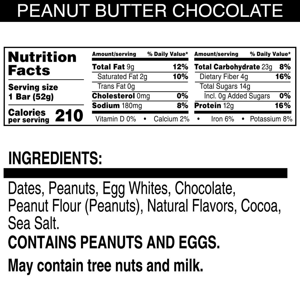 Ingredients: Dates, Peanuts, Egg Whites, Chocolate, Peanut Flour (Peanuts), Natural Flavors, Cocoa, Sea Salt. Contains: Contains peanuts and eggs. may contain tree nuts and milk.